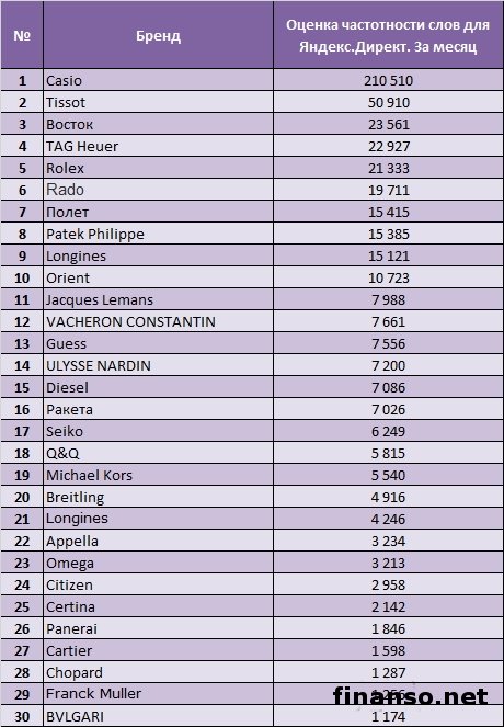 Несмотря на то что в настоящее время почти все люди всегда при себе носят сотовый телефон, который, в свою очередь, оснащается часами, фотоаппаратом, компасом, радио, многими иными гаджетами. Без всех этих на первый взгляд мелочей просто немыслима жизнь современного человека. В то же время такие вещи по отдельности тоже не теряют своей актуальности. К примеру, часы можно купить в обычной сувенирной лавке, в переходе метро, в самом обычном супермаркете, а также в самых дорогих бутиках по цене, что сравнима с довольно престижным авто. Вот и выходит, что часы - определенный аксессуар, который своим качеством, наличием и, безусловно, маркой указывает на статус человека. Об этом рассказывают специалисты издания онлайн «Украина сегодня: Finanso.net». Какие именно марки часов оказались самыми известными в числе российских граждан? Ответ на этот вопрос искали журналисты информационно-аналитического издания по экономике «Биржевой лидер». Рейтинг популярности марок часов у россиян в марте 2015 года.Для определения известности применяется система поиска Яндекс, рейтинг по которой составляется за счет: - сервиса «Подбор слов» (wordstat.yandex.ru) для определения количества упоминаний за последний месяц; - региона поиска – РФ; - периода анализа – март 2015 года. Из данных таблицы понятно, что самые известные у граждан России марки часов: ![]() - Casio - 210 510 запросов в системе поиска Яндекс за март 2015 года россиянами. Это производитель из Японии электронных устройств. Корпорация существует с апреля 1946 года в Токио. - Tissot – 50 910. Это популярная часовая компания из Швейцарии. Фирма обладает огромным успехом во всем мире, ее штаб-квартира расположена в Великобритании. Марка гордится своим наследием, принадлежностью к Федерации швейцарской часовой промышленности. - Восток – 23 561. Женские и мужские часы VOSTOK обладают надежным качеством Швейцарии, изготовлены в самом лучшем стиле. Производство каждой модели часов имеет связь с научным достижением в области советского автопрома, ракето-, авиа-, судостроения, приурочено к созданию конкретного авто, летательного аппарата, корабля или подводной лодки. Далее следуют марки: -TAG Heuer - 22 927 запросов в поисковой системе Яндекс; - Rolex - 21 333 запроса в поисковой системе Яндекс; - Rado - 19 711 запросов в поисковой системе Яндекс; - Полет - 15 415 запросов в поисковой системе Яндекс; - Patek Philippe - 15 385 запросов в поисковой системе Яндекс; - Longines - 15 121 запрос в поисковой системе Яндекс; - Orient - 10 723 запроса в поисковой системе Яндекс. |