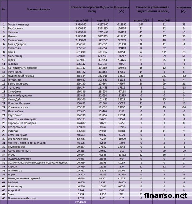 Современные мультипликационные фильмы считаются самым настоящим шедевром мультипликации. Кроме того, ни для кого не секрет, что их просмотром проводят время не лишь маленькие дети, но и большое количество взрослых. Ведь человек любого возраста может почерпнуть из них много веселого и интересного. Важен также и тот факт, что мультипликационная область как бизнес, а точнее как предмет для инвестирования, считается достаточно выгодной, потому что дает фактически полную гарантию своей окупаемости, будущего заработка. Об этом рассказывают журналисты информационного экономического издания онлайн «Украина сегодня: Finanso.net». Какие именно мультфильмы оказались самыми известными в числе граждан РФ в Интернете? Ответ на этот интересный вопрос отыскали журналисты информационно-аналитического издания по экономике и рынку Форекс «Биржевой лидер». Наиболее известные мультфильмы у россиян в Интернете.Рейтинг популярности мультиков был сформирован на основе трех основных критериев: - оценка частотности слов для системы Яндекс.Директ за месяц, что рассчитана при помощи сервиса wordstat.yandex.ru; - частота упоминаний о мультфильмах в интернет-изданиях РФ, что рассчитана при помощи агрегатора news.yandex.ru (Яндекс.Новости); - регион анализа (то есть поиска в сервисе wordstat.yandex.ru) – РФ. По данным таблицы понятно, что: - первое место в рейтинге досталось на этот раз мультфильму «Маша и Медведь», который повествует о взаимоотношениях медведя и маленькой неугомонной девочки Маши. Дети с большим интересом могут по несколько раз просматривать одни и те же серии. Этот мультик стал о самым просматриваемых в соцсети YouTube; - второе столь же почетное место досталось на этот раз мультфильму «Барбоскины», что рассказывает о дружной семье собак, где папа любит играть в ПК, сыновья увлекаются футболом, а девочки интересуются модой и красотой, мечтая лично познакомиться с любимой певицей - Жанной Киской; - третье место - мультфильм «Фиксики», где речь идет о маленьких человечках, которые живут внутри разных домашних приборов, помогают им всегда работать. Явные аутсайдеры рейтинга (менее 10 тысяч запросов в системе поиска Яндекс): - Астробой - 9 764 запроса в системе поиска Яндексе; - Эпик - 8 474 запроса в системе поиска Яндексе; - Приключения Десперо - 1 876 запросов в системе поиска Яндексе. |