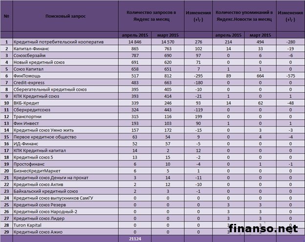 Кредитный союз относится к числу самых привлекательных финансовых организаций для граждан, которые формируют некоммерческую альтернативу банковским учреждениям. Работа кредитных союзов направлена по большей части на предоставление взаимной помощи и финансовой поддержки граждан. В Российской Федерации на данный момент работает примерно 2500 кредитных союзов. Они пользуются огромным успехом, потому что им под силу выдавать денежные ссуды клиентам с отрицательной кредитной историей в банках. Подробностями интересовались корреспонденты издания «Украина сегодня: Finanso.net». Какие именно современные кредитные союзы оказались самыми известными в числе российских активных пользователей глобальной сети Интернет? Ответ на этот вопрос искали специалисты информационно-аналитического издания «Биржевой лидер». Свежий рейтинг известности кредитных союзов среди граждан Российской Федерации сформирован по данным апреля этого года.Рейтинг был создан на основе двух вполне объективных, прозрачных показателей, что станут отличным помощником в вопросе выбора организации. Это: - общее количество вводимых запросов в систему поиска Яндекс за один месяц (регион поиска – Россия); - общее количество упоминаний одной или другой компании в масс-медиа, в онлайн-изданиях агрегатора новостей Яндекс.Новости; Самые известные кредитные союзы России: - Кредитный потребительский кооператив. Как раз по нему жители Российской Федерации успели произвести наибольшее количество запросов (14 846) в системе поиска Яндекс в апреле нынешнего года. - Капитал-Финанс – 865 запросов в Яндекс за апрель месяц; - Союзсберзайм – 787 запросов в Яндекс за апрель месяц. В число аутсайдеров попали такие кредитные организации: - Кредитный союз выпускников СамГУ – 0 запросов в Яндекс за апрель месяц; - Кредитный союз Резерв – 0 запросов в Яндекс за апрель месяц; - Кредитный союз Народный-2 – 0 запросов в Яндекс за апрель месяц; - Кредитный союз Лидер – 0 запросов в Яндекс за апрель месяц; - Turon Kapital – 0 запросов в Яндекс за апрель месяц; - Кредитный союз Ажио – 0 запросов в Яндекс за апрель месяц. Общее число запросов, которые были произведены по вышеуказанных кредитным союзам, достигает 21 124. Приблизительно 78 процентов из них пришлось на ТОП-3 лидеров. При этом лидер нынешнего рейтинга фирма - «Кредитный потребительский кооператив» - на себя взял сразу 70 процентов от общего списка запросов. |