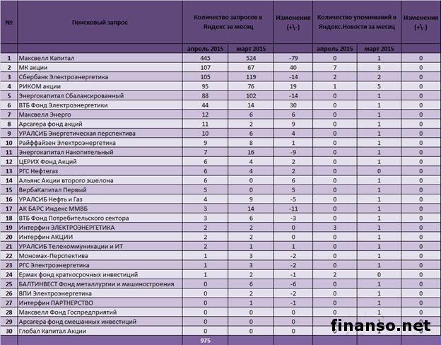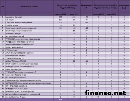 ПИФы – паевые инвестфонды. То есть, по сути, это учреждения, производящие доверительное управление имуществом, которое формируется из денежных средств вкладчиков посредством управляющего предприятия. Отсюда выходит, что каждый отдельно взятый вкладчик обладает своей частью имущества, которое состоит из паев. По большому же счету главная задача ПИФов - получение дохода на активы фонда, их распределение между самими инвесторами. Подробностями интересовались корреспонденты издания «Украина сегодня: Finanso.net». Для людей, что живут в РФ, паевые инвестиционные фонды открывают новую возможность инвестирования, представшую для них отличной альтернативой депозитам банков. В настоящее время ПИФы становятся все более востребованными среди как профессиональных инвесторов, так частных лиц. Какие именно ПИФы оказались самыми известными у граждан России? Ответ на этот вопрос отыскали специалисты информационно-аналитического издания по экономике и предпринимательству «Биржевой лидер». Рейтинг известности ПИФов среди россиян в Яндексе.Для определения известности ПИФов принято использовать поисковую систему Яндекс, рейтинг по коей формируются благодаря: - сервису «Подбор слов» (wordstat.yandex.ru) для четкого определения числа упоминаний за последний месяц; - региону поиска – РФ. Из показателей таблицы видно, что: - первое почетное место по известности среди паевых инвестиционных фондов занимает «Максвелл Капитал», потому что именно по нему граждане РФ произвели самое большое число запросов в системе поиска Яндекс за апрель нынешнего года (445); - второе место – «МК акции» - 107 запросов в системе поиска Яндекс; - третье место отдано «Сбербанк Электроэнергетика» - 105 запросов в системе поиска Яндекс за месяц. Далее участники рейтинга расположились так: - РИКОМ акции – 95 запросов в системе поиска Яндекс; - Энергокапитал Сбалансированный – 88 запросов в системе поиска Яндекс; - ВТБ Фонд Электроэнергетики – 44 запроса в системе поиска Яндекс; - Максвелл Энерго – 12 запросов в системе поиска Яндекс; - Арсагера фонд акций – 11 запросов в системе поиска Яндекс; - УРАЛСИБ Энергетическая перспектива – 10 запросов в системе поиска Яндекс; - Райффайзен Электроэнергетика – 9 запросов в системе поиска Яндекс; - Энергокапитал Накопительны1 – 7 запросов в системе поиска Яндекс; - ЦЕРИХ Фонд Акций – 6 запросов в системе поиска Яндекс; - РГС Нефтегаз – 6 запросов в системе поиска Яндекс; - Альянс Акции второго эшелона – 6 запросов в системе поиска Яндекс. |