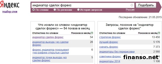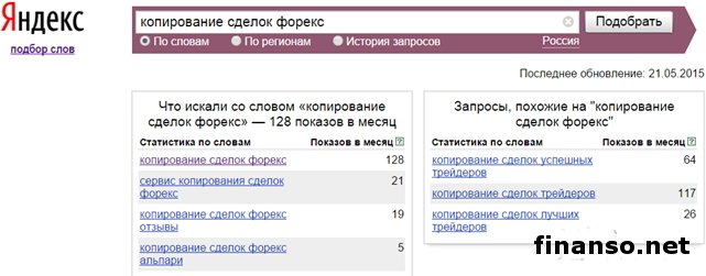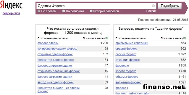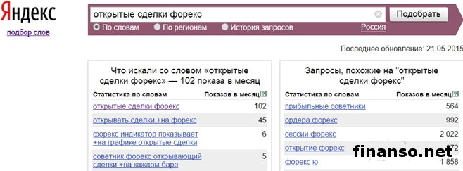 Для определения хода мыслей граждан того или иного государства или их предпочтений, которые напрямую касаются определенного вопроса, стоит провести четкий анализ их запросов поиска в наиболее крупных системах поиска мира. К такому выводу пришли специалисты. При этом, судя по опыту, они полностью правы. Ведь если современный человек хочет пополнить багаж знаний в отношении какого-то определенного вопроса, он для начала обращается к глобальной паутине, за поиском правильного ответа. Например, каждый когда-то в своей жизни пересекался с таким понятием, как «Форекс», многие, возможно, даже имеют определенное представление о том, что это такое. И тем не менее для получения более глубоких познаний по этому вопросу стоит обратиться к знакомым, хорошо знающим Форекс, или к Интернету, где можно отыскать все нужные ответы. Выходит, что, проведя подробный анализ запросов поиска, специалисты четко узнают, насколько этот вопрос был интересен россиянам, какими еще вопросами на подобную тему они интересовались за определенный временной период. Какие наиболее интересные, востребованные запросы оказались для россиян в тематике «сделки Форекс» в поисковой системе Яндекс в мае 2015 года, разбирались аналитики информационного издания по экономике «Украина сегодня: Finanso.net». «Сделки Форекс» глазами россиян в системе поиска Яндекс.Рейтинг известности запросов у россиян специалистами издания «Биржевой лидер» формируется по: - частотности слов для системы Яндекс.Директ за месяц, что рассчитана с помощью сервиса wordstat.yandex.ru; - регион анализа (то есть поиска в сервисе wordstat.yandex.ru) – РФ. По полученным данным Яндекс.Директ, запрос «сделки Форекс» был введен 1 200 раз в системе поиска Яндекс в мае этого года. Первое место по общему числу запросов в системе поиска Яндекс по заданной теме оказалось у понятия «копирование сделок Форекс» (128 запросов за месяц). Также вместе с ним искали: - сервис копирования сделок Форекс – 21 запрос в системе поиска Яндексе; - копирование сделок Форекс отзывы – 19 запросов в системе поиска Янжекс; - копирование сделок Форекс альпари – 5 запросов системе поиска Яндекс. Второе место отдано запросу «открытые сделки Форекс», по нему было произведено 102 запроса в системе поиска Яндекс за месяц. Вместе с этим запросом искали: - открывать сделки +на Форекс – 45 запросов в системе поиска Яндекс; - Форекс индикатор показывает +на графике открытые сделки – 6 запросов в Яндекс; - советник Форекс, открывающий сделки +на каждом баре – 16, и другие, подобные этим, запросы в Яндексе. - Третья строка рейтинга - «индикатор сделок Форекс», по нему произведено 54 запроса за месяц в Яндекс. С ним искали: - индикатор выхода +из сделки Форекс - 28 запросов в системе поиска Яндексе; - Форекс индикатор показывает +на графике открытые сделки – 6. |