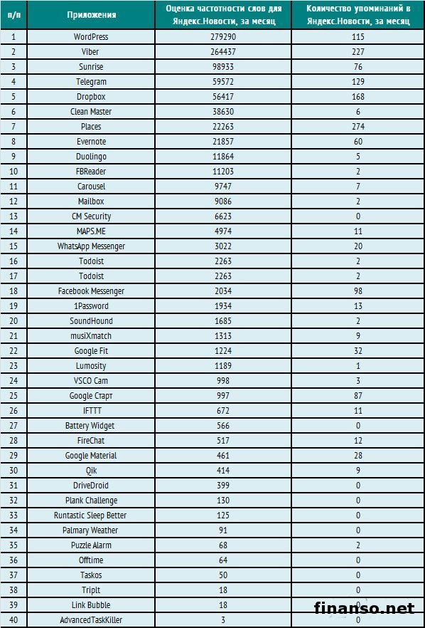 К настоящему моменту времени большая часть граждан из России применяют современные гаджеты с огромным количеством функций. И для результативного функционирования смартфонов нужно специально установить разные удобные и полезные приложения. Все они будут помогать и облегчать жизнь и работу владельца смартфона. Именно в связи с этим фактом и появилась необходимость изучить самые популярные и востребованные приложения для операционной системы Android, определить наиболее известные из них среди граждан России. Подробностями интересовались корреспонденты издания «Украина сегодня: Finanso.net». Какие именно современные приложения для «Андроида» пользуются самой значительной популярностью у российских жителей в текущем месяце? Ответ на этот вопрос активно искали специалисты информационного издания по экономике и предпринимательству «Биржевой лидер». «WordPress», «Viber» – наиболее известные у россиян приложения.Рейтинг известности приложений был сформирован на базе нескольких разных критериев: - оценка частотности слов для системы Яндекс.Директ за последний месяц, что рассчитана при помощи специального сервиса wordstat.yandex.ru; - частота упоминаний о приложениях, что рассчитана с помощью агрегатора news.yandex.ru (Яндекс.Новости); - регион анализа (то есть поиска в сервисе wordstat.yandex.ru) – Российская Федерация. Первое почетное место лидера досталось по праву приложению под названием WordPress (279 290 запросов в системе поиска Яндекс за последний месяц). Это приложение собой представляет отличную платформу для публикации, которая ориентируется на поддержку стандартов, удобство применения. Второе, не менее почетное место досталось в этом месяце приложению, известному как Viber (264 437 запросов в поисковой системе Яндекс за последний месяц). Это приложение помогает отправлять бесплатно разные сообщения, а также звонить пользователям на различные устройства в самых разных уголках всего земного шара и сетях. Viber практически синхронизирует ваши контакты, сообщения, весь журнал звонков с вашим устройством. Третья позиция по известности досталась приложению Sunrise (98 933 запроса в поисковой системе Яндекс за последние 30 дней). Это приложение заменяет календарь, давая возможность все держать под строгим контролем. Далее расположились такие приложения: - Telegram – 59 572 запроса в Яндексе за месяц; - Dropbox – 56 417 запросов запроса в Яндексе за месяц; - Clean Master – 38 630 запросов в Яндексе за месяц; - Places – 22 263 запроса в Яндексе за месяц, по данным брокера Норд ФХ. |