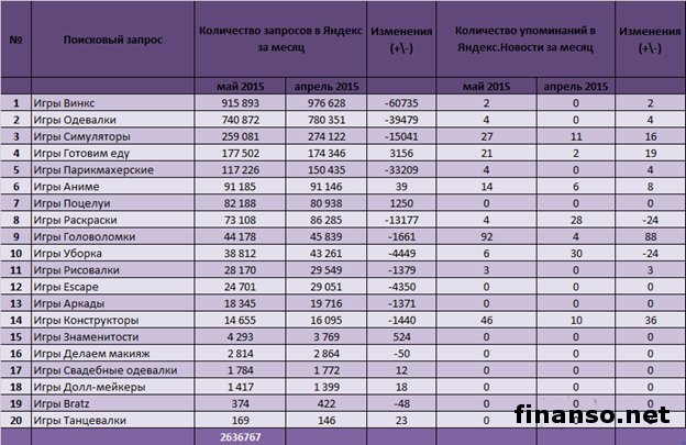 Конечно же, в наше время именно игры для ПК считаются по праву наиболее доходной индустрией для вкладывания денег. Дело в том, что именно игры для ПК в разные времена пользовались просто огромным успехом среди всех людей. А в последнее время ими начали все активнее интересоваться еще и самые маленькие представители жителей планеты Земля. Именно по этой простой причине детские игры тоже стали набирать недюжинную популярность. Подробностями интересовались корреспонденты издания «Украина сегодня: Finanso.net». И все-таки разнообразие игровых проектов поражает любое воображение. При этом их с каждым днем становится все больше и больше. Однако есть все же определенные проекты, которые уже успели стать наиболее популярными и известными. Какие именно наиболее известные игровые проекты для девочек попали в число самых распространенных и всеми любимых у многочисленных наиболее активных пользователей соцсети «Одноклассники», а также у россиян, что привыкли использовать для запросов систему поиска Яндекс? Ответ на этот вопрос отыскали специалисты новостного сайта «Биржевой лидер». Рейтинг известности игровых проектов для девочек в Сети за май месяц.Рейтинг известности среди россиян игровых проектов для маленьких девочек был сформирован по двум базовым критериям: - оценка частотности слов для системы поиска Яндекс.Директ за последний месяц, что рассчитывается традиционно с помощью специального сервиса wordstat.yandex.ru; - общее число упоминаний за то же самое время о том или ином проекте для девочек в электронных СМИ, что рассчитывается при помощи агрегатора Яндекс.Новости (news.yandex.ru); - регион оценки – Россия. Первое почетное место лидера на этот раз досталось игровому проекту «Винкс», созданному на основе одноименного мультика «Клуб Винкс: школа волшебниц», который также очень популярен среди девочек (915 893). Второе место досталось проекту - игры «Одевалки», который помогает девочкам показывать свою фантазию и другие не менее интересные таланты (740 872). Третье место – игровые проекты «Симуляторы», что успешно имитируют управление каким-то транспортным средством, к примеру, мотоциклом, авто, самолетом или поездом (259 081). Далее следуют игры: - Игры Готовим еду - 177 502; - Игры Аниме -91 185; - Игры Парикмахерские - 117 226; - Игры Поцелуи - 82 188; - Игры Головоломки - 44 178; - Игры Раскраски - 73 108; - Игры Уборка - 38 812; - Игры Escape - 24 701; - Игры Рисовалки - 28 170; - Игры Аркады - 18 345; - Игры Знаменитости- 4 293; - Игры Конструкторы - 14 655; - Игры Делаем макияж - 2 814; - Игры Долл-мейкеры - 1 417; - Игры Свадебные одевалки - 1 784. |