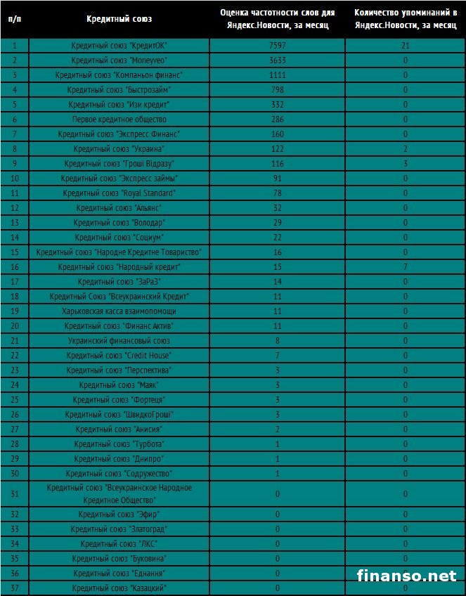Из-за сложной финансовой обстановки, которая сейчас фиксируется в Украине по причине ведения на востоке страны военных действий, и кризисного положения, гражданам приходится все чаще на себе ощущать нехватку финансовых средств. Опираясь на заработки семьи, многие из них могут могут достойно выходить из сложившегося положения, просто начав себя в чем-то ограничивать или экономить на определенных вещах. Все остальные вынуждены обращаться к различным финансовым организациям, чтобы оформить хоть незначительный, но такой необходимый кредит. Подробностями интересовались корреспонденты издания «Украина сегодня: Finanso.net». Именно из-за этого сервисы небанковского кредитования быстро набирают в наше время популярность. Кроме того, весомым фактором считается отказ большей части банков в кредитовании физлиц, серьезное ужесточение условий по их оформлению. Здесь обычным людям на помощь чаще приходят некоммерческие финансовые организации, что занимаются финансовой взаимопомощью за счет предоставления ссудо-сберегательных услуг гражданам. Какие именно современные сервисы небанковского кредитования пользуются самой большой известностью у украинских граждан? Ответ на этот вопрос искали специалисты издания «Биржевой лидер». Топ популярных кредитных союзов Украины в сети.Рейтинг известности кредитных союзов сформирован на базе таких критериев: - оценка частотности слов для системы поиска Яндекс.Директа за один месяц, что рассчитана при помощи сервиса wordstat.yandex.ru; - частота упоминаний о союзах, которая рассчитана с помощью агрегатора news.yandex.ru (Яндекс.Новости); - регион анализа (то есть поиска в сервисе wordstat.yandex.ru) – Украина. Самые известные кредитные союзы у россиян в глобальной сети: - ИД-Финанс – 1 424 запроса в системе поиска Яндексе за месяц; - Кредитный союз «КредитОК» – 7 597 запросов в системе поиска Яндексе за месяц; - Кредитный союз «Moneyveo» – 3 633 запроса в системе поиска Яндексе за месяц; - Кредитный союз «Компаньон финанс» – 1 111 запросов в системе поиска Яндексе за месяц; - Кредитный союз «Быстрозайм» – 798 запросов в системе поиска Яндексе за месяц; - Кредитный союз «Изи кредит» – 332 запроса в системе поиска Яндексе за месяц; - Первое кредитное общество – 286 запроса в системе поиска Яндексе за месяц; - Кредитный союз «Экспресс Финанс» – 160 запросов в системе поиска Яндексе за месяц; - Кредитный союз «Украина» – 122 запроса в системе поиска Яндексе за месяц; - Кредитный союз «Гроші Відразу» – 116 запросов в системе поиска Яндексе за месяц; - Кредитный союз «Экспресс займы» – 91 запрос в системе поиска Яндексе за месяц. |