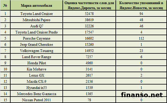 В настоящее время, когда лето в разгаре, многие отправляются в путешествия. И подобные поездки не всегда предполагают отдых на обустроенных курортах: часто выходцы из разных уголков мира отдают предпочтение наслаждению досугом где-то в лесу или горах. А дороги к таким местам отдыха достаточно сложно проходимые. Именно поэтому и были созданы спецавтомобили - внедорожники, которые помогают олигархам, звездам шоу-бизнеса, депутатам и иным людям преодолеть сложности, путешествовать, где хочется. Подробностями интересовались корреспонденты издания «Украина сегодня: Finanso.net». Какие бренды внедорожников в настоящее время считаются наиболее известными у россиян? Какие марки бьют рекорды продаж? с ответами на эти и другие подобные вопросы разбирались специалисты портала «Биржевой лидер». Рейтинг популярности внедорожников в сети Интернет.Рейтинг популярности внедорожников в РФ был сформирован на основании двух объективных показателей: - общее число запросов по типу «марка внедорожника» в системе поиска Яндекс; - общее количество упоминаний бренда внедорожника в масс-медиа, которое рассчитано с помощью агрегатора Яндекс.Новости; - регион оценки – РФ. Место лидера в рейтинге самых известных в РФ внедорожников занимает Toyota Land Cruiser (52 478 запросов за месяц в Яндексе). Вот уже более 60-ти лет выпускается это авто, помогая пользователям путешествовать. Стоимость у этого внедорожника больше, чем у Mitsubishi Pajero, однако здесь необходимо сосредоточить внимание на том, что цена авто прямо зависит не лишь от общих технических характеристик, популярности марки, однако и от его комплектации. Второе не менее почетное место популярности - Mitsubishi Pajero (38 619 запросов за месяц в Яндексе), который характеризуется на самом деле хорошей проходимостью, невысокой стоимостью и вместительным багажником. Третье место рейтинга известных внедорожников в РФ занимает Audi Q7 (32 226 запросов за месяц в Яндекс), полноразмерный кроссовер, выпускающийся фирмой Audi. Здесь крайне важно отметить и его качество, и брендовое имя. Это тот случай, когда стоимость автомашины будет несколько выше из-за марки. Аутсайдеры автомобильного рынка Российской Федерации: - Land Rover Range – 7 257 запросов в Яндексе; - Honda Pilot – 4 960 запросов в Яндексе; - Kia Mohave – 3 141 запрос в Яндексе; - Lexus GX – 2 617 запросов в Яндексе. |