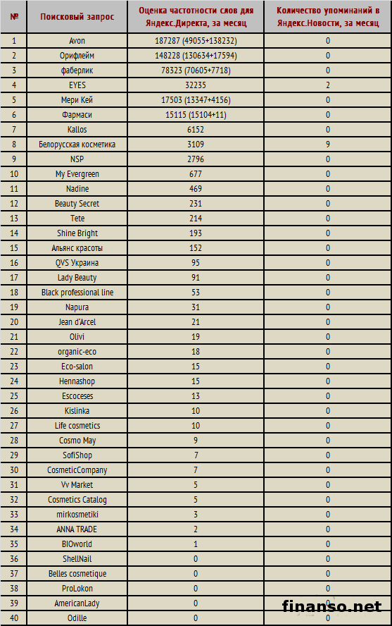 Неотъемлемая часть образа каждой представительницы прекрасной половины человечества – качественные духи, представляющие собой своеобразное платье, элегантно облегающее тонкий стан, а также нежно тянущееся шикарным шлейфом. Совсем ведь неслучайно в Британии принято использовать выражение «носить духи», так как аромат должен подчеркнуть индивидуальность, дополнить ваш неповторимый образ. Подробностями интересовались корреспонденты издания «Украина сегодня: Finanso.net». Но какие именно своевременные онлайн-магазины парфюмерии выбирают для себя российские граждане? Каким именно образом пиар оказывает свое особое влияние в глобальной сети Интернет на общий рейтинг известности среди потребителей? В этих и остальных не менее важных вопросах разбирались специалисты экономического журнала онлайн «Биржевой лидер». Рейтинг наиболее известных онлайн-магазинов парфюмерии в сети.Рейтинг известности онлайн-магазинов парфюмерии был сформирован на базе таких критериев: - оценка частотности слов для системы поиска Яндекс.Директ за месяц, что рассчитана с помощью сервиса wordstat.yandex.ru; - частота упоминаний об онлайн-магазинах, что рассчитана с помощью агрегатора news.yandex.ru (Яндекс.Новости); - регион анализа (то есть поиска в сервисе wordstat.yandex.ru) – все государства СНГ. Самые популярные интернет-магазины парфюмерии в числе россиян в сети: - Avon – 512 483 запроса в Яндексе за месяц; - Oriflame – 69 889 запросов в Яндексе за месяц; - Cosmetic – 52 612 запросов в Яндексе за месяц; - MaryKay – 29 176 запросов в Яндексе за месяц; - Lush – 21 678 запросов в Яндексе за месяц; - Aromas – 21 572 запроса в Яндексе за месяц; - Классико – 17 621 запрос в Яндексе за месяц; - Bonjour – 10 541 запрос в Яндексе за месяц; - Л'Этуаль – 7 100 запросов в Яндексе за месяц; - Delicate – 7 026 запроса в Яндексе за месяц. Аутсайдеры обновленного рейтинга популярности на этот раз выглядит следующим образом: - SmartSmell – 9 запросов в Яндексе; - Mirparfuma – 8 запросов в Яндексе за месяц; - Toparoma – 6 запросов в Яндексе за месяц; - Aromaclub – 5 запросов в Яндексе за месяц; - Парфюмаг – 3 запроса в Яндексе за месяц; - Elparfum – 2 запроса в Яндексе за месяц; - все волны косметики и парфюмерии – 2 запроса в Яндексе за месяц; - Xparfum – 1 запрос в Яндексе за месяц; - Парфюм Shopper – 1 запрос в Яндексе за месяц; - Мальва Парфум – 0 запросов в Яндексе за месяц; - Aromasky – 0 запросов в Яндексе за месяц; - Vit'Ю – 0 запросов в Яндексе за месяц. |