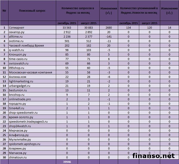 Безусловно, человеческая внешность обладает важным значением, потому что природой заложено желание выглядеть максимально хорошо. Изысканный парфюм, качественная обувь, шикарное авто, фирменный костюм – это все крайне значимые детали стиля. В то же время наручные часы играют далеко не последнюю роль. В настоящее время они применяются не только для контроля времени. Помимо прочего, им под силу рассказать многое о своем владельце. Исходя из этого, важно выбрать подобный аксессуар, который бы максимально точно передавал индивидуальность. Подробностями интересовались корреспонденты информационно-аналитического издания онлайн «Украина сегодня: Finanso.net». Какие именно современные марки часов оказались самыми известными в числе российских граждан? Ответ на этот вопрос искали журналисты информационно-аналитического издания по экономике и предпринимательству «Биржевой лидер». ТОП популярности марок часов среди россиян за последний месяц.Для четкого определения известности принято использовать поисковую систему Яндекс, рейтинг по которой формируется за счет: - сервису «Подбор слов» (wordstat.yandex.ru) для четкого определения числа упоминаний за последние 30 дней; - регион поиска – Россия; - период анализа – ноябрь 2015 года. Из показателей таблицы понятно: самые известными в числе российских граждан марками часов признаны в этом месяце: - Casio – 53 623 запроса в системе поиска Яндекс, которые были произведены гражданами России в октябре текущего года; - Восток – 22 365 запросов в системе поиска Яндекс; - Полет – 21 256 запросов в системе поиска Яндекс. ТОП популярности онлайн-продавцов часов за последний месяц в Яндексе.Рейтинг формируется на основании двух прозрачных и объективных показателей, которые помогут в выборе организации. Это: - количество вводимых запросов в систему поиска Яндекс за последний месяц (регион поиска – Россия); - общее количество число упоминаний той или иной фирмы в средствах массовой информации, то есть в онлайн-изданиях агрегатора новостей Яндекс.Новости; - наиболее популярным стал интернет-ресурс, специализирующийся продажей часов, оказался Сотмаркет (33 563 запроса в системе поиска Яндекс за месяц); - второе место занимает Секатор.ру, по нему было произведено 2 912 запросов в системе поиска Яндекс за месяц; - третье место закрывает ТОП alltime.ru с 2 236 поисковыми запросами в системе поиске Яндекс. |