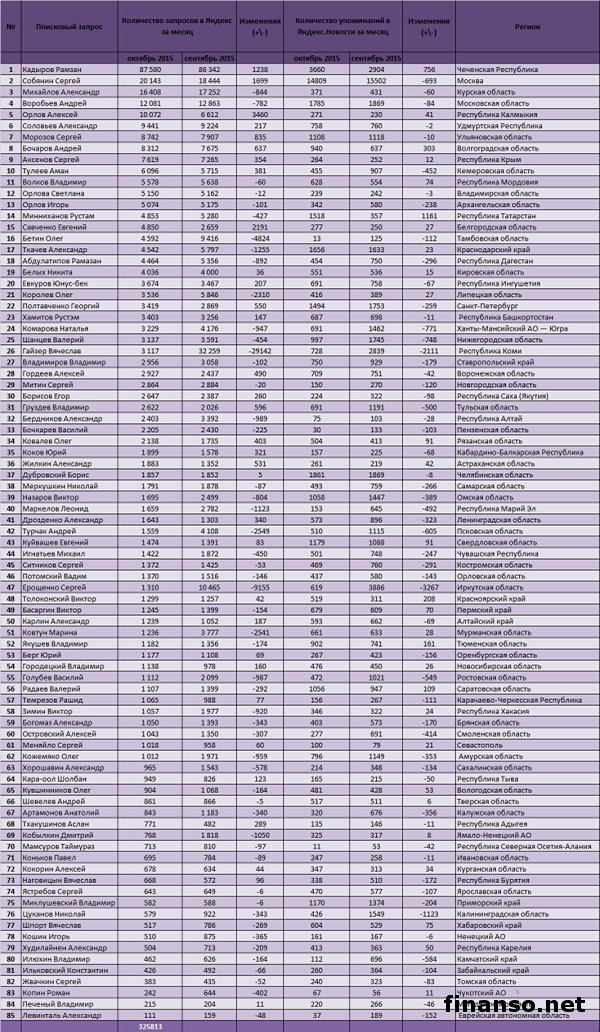 Политическая обстановка в государстве всегда считалась ключевой тематикой для обсуждения. Она зачастую вызывает множество вопросов и споров. Кто наиболее популярен из российских глав? Этот вопрос крайне сложный, потому что современная политика предполагает не просто исключительное мастерство выполнения президентских указов, решений Государственной думы и правительства, российскими губернаторами, но также и умение достучаться до сердец избирателей, стать авторитетным в своем районе. Подробностями интересовались корреспонденты информационно-аналитического издания по экономике «Украина сегодня: Finanso.net». По сообщениям портала по экономике, финансам и рынку валют Форекс «Биржевой лидер», достаточно сложной задачей становится формирование особого рейтинга российских глав регионов при помощи вполне объективного критерия, что без особых сложностей можно будет выяснить и проверить, у кого из губернаторов снижается общий уровень известности, а у кого возрастает, каковы основные причины такого положения дел. Кто из современных глав российских регионов признан самым известным среди пользователей глобальной сети Интернет? Ответ на этот вопрос искали специалисты издания по экономике и предпринимательству «Биржевой лидер». Наиболее цитируемые губернаторы России в Глобальной сети.Рейтинг цитируемости глав российских регионов формировался на основании трех основных критериев: - оценка частотности слов для системы поиска Яндекс.Директ за последний месяц, которая рассчитана с помощью сервиса wordstat.yandex.ru; - частота упоминаний о губернаторах, которая рассчитана при помощи агрегатора news.yandex.ru (Яндекс.Новости); - регион анализа (а значит, поиска в сервисе wordstat.yandex.ru) – Россия. Таблица показывает: - первое место по популярности среди российских региональных глав занимает Рамзан Кадыров, глава Чеченской Республики, потому что по нему российские граждане произвели самое большое число запросов в октябре нынешнего года (87 580 запросов); - второе место отдано на этот раз по праву Сергею Собянину, главе города Москвы, с его 20 143 запросами в Яндекс за последний месяц; - третье место рейтинга досталось на этот раз Михайлову Александру, главе Курской области России, по которому было произведено в общей сложности 16 408 запросов в поисковой системе Яндекс. |