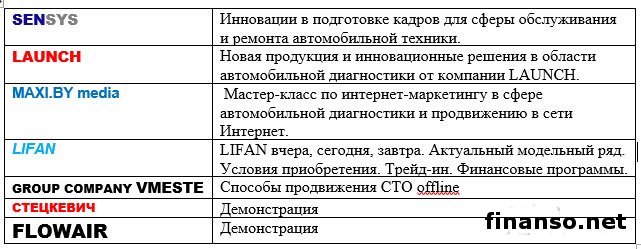 Приглашаем поучаствовать в первом Республиканском состязании среди специалистов автосервисных услуг СЕРВИС МАСТЕР 2017 Как передают корреспонденты "Украина сегодня: Finanso.net", 1-2 июня текущего года в Минске на базе «LIFAN ЦЕНТР МИНСК» будет организовано первое в Беларуси мероприятие-соревнование среди профессионалов автосервисных услуг, которые также включает в себя еще и автобизнес-форум – «СЕРВИС МАСТЕР 2017» номинация «Автомобильный диагност». За звание самого лучшего автодиагноста будут бороться представители автомобильных сервисов со всех уголков Беларуси. На мероприятие собираются также и руководители средних и малых сервисов, индивидуальные предприниматели, которые внимательно относятся к развитию и современности своего автобизнеса. Для слушателей состязания будут организованы доклады, семинары, мастер-классы и демонстрации от лидеров белорусского автопрома: одна из ведущих корпораций в республике, которая осуществляет подготовку специалистов в области автобизнеса – Академия автобизнеса SENSYS; высокотехнологичная корпорация по разработке, продаже и производству автодиагностического и общегаражного оборудования – LAUNCH; ведущая компания Европы по производству профессиональной химпродукции, оборудования, монтажного и крепежного материала, инструмента для автосервисов - FÖRCH; группа корпораций, которые специализируются на технологических разработках и производстве, экспорте и продаже автомобилей, двигателей, мотоциклов – LIFAN; одно из лидирующих сертифицированных онлайн-агентств, занимающихся интернет-рекламой и продвижением бизнеса, лучшее онлйан-агентство по продвижению компаний в сфере автобизнеса – MAXI.BY media; лидер среди дизайн студий, предлагающих широкий спектр услуг по созданию бренда и имиджа корпорации для сферы автобизнеса – GROUP COMPANY VMESTE; ведущая компания в Беларуси по комплексному обеспечению профессионалов защитой от всех известных вредных факторов на производстве – СТЕЦКЕВИЧ; одна из лидеров среди европейских компаний, разрабатывающих и внедряющих инновации в сфере воздушного отопления и вентиляции, с особым учетом энергосбережения, современного дизайна, применения уникальных методов управления – FLOWAIR; Программа выступлений 2-го дня мероприятия «Service Master - 2017» Регламент конкурса «Сервис-Мастер 2017» в номинации «Автомобильный диагност». Конкурс состоит из 2 составляющих: теоретический тест и практические задания на определение в тестовых автомобилях неисправностей. Первая часть – теоретический тест (01.06.2017) состоит из 30 вопросов, которые нужно решить за 65 мин. Вторая часть – решение практических заданий (02.06.2017) проходит по типу одновременного парно-параллельного старта. 2 участникам даются по 2 автомобиля с одинаковыми неисправностями. Для 1 участника число неисправностей составляет 6. Три неисправности относятся к электрической части авто, три - к системе управления ДВС. Задача участника - за указанное время указать присутствующую неисправность. Чтобы определить победителя применяются такие критерии: • время; • точность; • вес (сложность). Время для решения практических задач – 50 мин. Победителем станет участник, который наберет максимальную сумму баллов. Стоимость пакета участника Service Master-2017: 60,00 BYN Регистрация на сайте: www.smaster.pro Организатор: Инжиниринговый центр SENSYS (ссылка на сайт 
