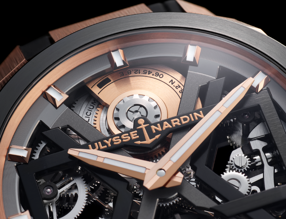 АЭРОДИНАМИКА КАК ВДОХНОВЕНИЕ ДЛЯ ВЫСОКОГО ЧАСОВОГО ИСКУССТВАНа создание внешнего вида BLAST, Ulysse Nardin вдохновили самолеты-невидимки – разработчики дизайна сумели вложить стиль авиации в плоскость швейцарских часов. Стелс-технологии, использующиеся боевыми машинами для снижения заметности в различных областях спектра, теперь отражены в дизайне часов. SKELETON X, FREAK X, DIVER X – модели Х-фактора, новые швейцарские часы BLAST не стали исключением и также имеют символ Х. Новая модель наручных часов сильна своим механизмом UN-172 – это усовершенствованный калибр UN-171. Детали проработаны максимально точно, а каждое их действие выверено до мелочей. Коллекция часов BLAST представлена четырьмя образцами: Розовое золото – модель «Огонь»Диаметр часов 45 миллиметров, напыление DLC черного цвета с золотыми вставками. Турбийон из золота, безель из черной керамики, символ Х черный, стрелки часов и метки покрыты напылением Superluminova.