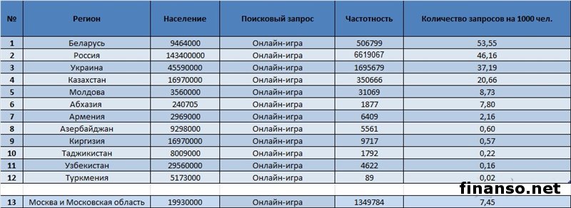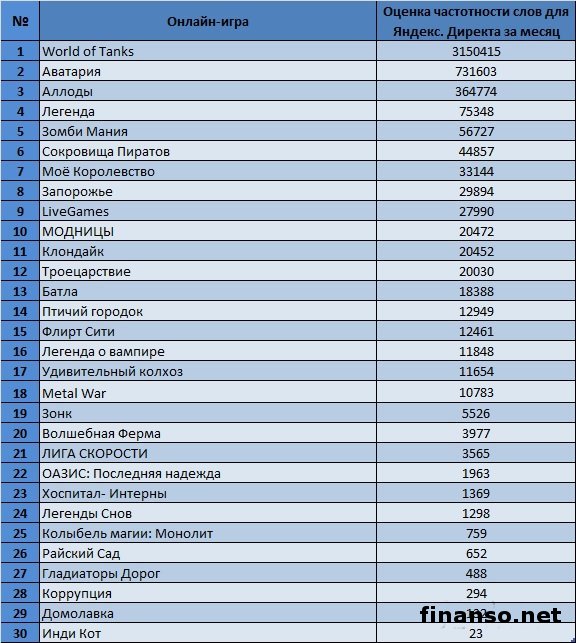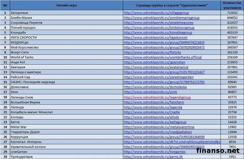Какие же самые популярные онлайн-игры в социальной сети «Одноклассники» решили разобраться аналитики раздела «Новости социальной сети Одноклассники» журнала для трейдеров и инвесторов «Биржевой лидер». Запорожье и Зомби мания -самые популярные онлайн-игры среди в соцсети «Odnoklassniki.ru».Как определить популярность той, или иной игры в соцсети? Аналитики «Биржевого лидера» делают это по понятной для всех схеме: чем большее количество участников в группе, посвященной онлайн игре, тем большей популярностью эта игры пользуется. Как видно из рейтинга, бесспорным лидером по количеству участников в группе в соцсети «Одноклассники» стала онлайн-игра «Запорожье» (713023 участника), в которой любой желающий сможет почувствовать себя настоящим фермером. Следует отметить, что данная игра не имеет никаких ограничений по возрасту, а значит играть в нее могут все, от мала до велика, получая при этом несказанное удовольствие. Второе место по количеству участников в группе стала игра «Зомби мания» (644088 участника). Игра создана специально для тех, кому надоели стандартные человеческие персонажи, и хочется внести в свою игру какую-нибудь новинку. Здесь и зомби и пираты, и битвы и поиски сокровищ, в общем все, что нужно для адреналина. Третьей по популярности игрой в соцсети «Одноклассники.ру» стала «Сокровища Пиратов», в группе которой состоит 422430 человек. В этой игре человек найдет и настоящие карты сокровищ, и множество увлекательных мини-игр, которые не оставят равнодушными ни одного, даже самого черствого человека. World of Tanks и Аватария - самые популярные онлайн-игры по версии поисковой системы Яндекс.Благодаря возможностям поисковой системы Яндекс, а точнее ее сервиса «Подбор слов», аналитикам «Биржевого лидера удалось узнать количество запросов по всем вышеуказанным играм, которые вводились в данной поисковой системе за последний месяц, и тем самым определить их популярность. Как видно из таблицы, ситуация несколько поменялась, и больше всего запросов за последний месяц в поисковой системе Яндекс вводили по игре «World of Tanks» - 3150415. На втором месте оказалась «Аватария» с 731603 запросами за месяц, а трете место досталось игре «Аллоды» (364774). Далее следуют: - Легенда – 75348 запросов в Яндексе за месяц; - Зомби Мания – 56727; - Сокровища Пиратов – 44857; - Моё Королевство – 33144; - Запорожье – 29894; - LiveGames – 27990; - МОДНИЦЫ – 20472; - Клондайк – 20452; - Троецарствие – 20030; - Батла – 18388; - Птичий городок – 12949; - Флирт Сити – 12461; - Легенда о вампире – 11848; - Удивительный колхоз – 11654; - Metal War – 10783; - Зонк – 5526; - Волшебная Ферма – 3977; - ЛИГА СКОРОСТИ – 3565; - ОАЗИС: Последняя надежда – 1963; - Хоспитал- Интерны – 1369; - Легенды Снов – 1298; Практически не интересуются в поисковой системе Яндекс такими играми: - Колыбель магии: Монолит – 759 запросов за месяц; - Райский Сад – 652; - Гладиаторы Дорог – 488; - Коррупция – 294; - Домолавка - 132; - Инди Кот – 23. Популярность запроса «онлайн-игра», согласно данным поисковой системы Яндекс.Благодаря поисковой системе Яндекс, аналитики «Биржевого лидера» так же смогли получить данные по количеству вводимого запроса «онлайн-игра» за последний месяц. Как видно из фото, размещенного выше, запрос «онлайн-игра» пользователи всемирной паутины вводили 9277269 раз за последний месяц. Вместе с данным запросом так же искали: - Онлайн игры бесплатно – 4695344 запроса в поисковой 