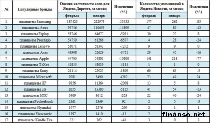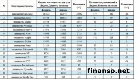 В наши дни все большую популярность набирают планшеты, которые могут заменить ноутбук или же персональный компьютер, и кроме того они обладают массой преимуществ, начиная от удобства использования и заканчивая компактными размерами. Но подобрать производительное устройство и адекватном ценовом диапазоне достаточно трудно по причине того, что на рынке появилось довольно много устройств различных компаний-производителей, о чем рассказали корреспонденты издания «Украина сегодня: Finanso.net». В том, какие самые популярные бренды планшетов среди россиян, разобрались эксперты журнала для инвесторов «Биржевой лидер».Рейтинг популярности планшетов.Данный рейтинг составлен при помощи двух критериев поисковой системы Яндекс: первый – оценка частоты употребления слов в поисковой системе Яндекс, второй – количество упоминания производителей планшетов в интернет СМИ. Как можно увидеть, лидером популярности среди производителей планшетов в Интернете стала торговая марка «Samsung», которая получила 187 423 поисковых запросов в системе Яндекс. Отметим, что устройства этой компании отличаются многообразием моделей, оригинальным дизайном и отличным сочетанием привлекательного внешнего вида и технических свойств. Второе место занимают планшеты торговой марки Asus, которые получили 95 756 поисковых запросов. Эти устройства имеют довольно мощный аккумулятор и процессор, а также крупные объемы памяти и довольно удобный интерфейс. На третьей строчке расположились планшеты марки Explay, которые получили 58 746 запросов. Эти устройства имеют довольно тонкий и легкий корпус, что обеспечивает легкое использование этого устройства при современном ритме жизни. В то же время малоизвестными торговыми марками планшетов в феврале 2014 года стали бренды планшетов: - планшеты «HTC» (3 409 запросов); - планшеты «Pocketbook» (2 461 запрос); - планшеты «Hyundai» (1 977 запросов); - планшеты «Viewsonic» (1 397 запросов); - планшеты «Kindle Fire» (321 запрос). Всего по данным брендам было произведено 643 292 запроса, из которых 53% пришлось на тройку лидеров, а 29% - на лидера данного рейтинга – планшеты торговой марки «Samsung». |