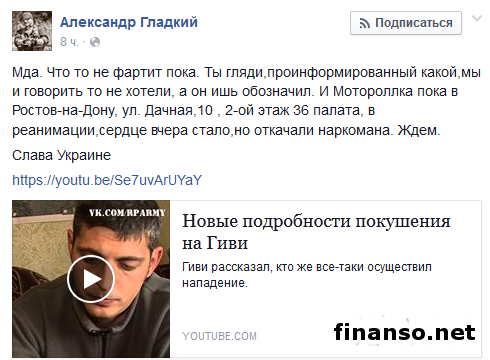 Как удалось выяснить корреспондентам издания «Украина сегодня: Finanso.net», в своем аккаунте Александр Гладкий написал: «Мда. Что-то не фартит пока. Ты посмотри, какой проинформированный, мы не хотели даже говорить, а они взяли и обозначили. И Моторола в настоящее время находится в Ростове-на-Дону, улица Дачная, 10, 2-й этаж, палата №36. Лежит в реанимации. Вчера остановилось его сердце, но врачи откачали наркомана. Ждем». В это же время Александр Гладкий опубликовал ссылку на интервью главаря воюющего на Донбассе незаконного вооруженного формирования «Сомали» по кличке Гиви (Михаил Толстых). Покушение на Гиви.Так, Гладкий написал, что Гиви подтвердил информацию о том, что на него было совершено покушение в Макеевке, что в Донецкой области. Он не исключил, что к покушению могут быть причастны партизаны «Тени». Кроме того, террорист Гиви пожаловался, что во время покушения сработал эффект неожиданности, ведь в этот момент он не ждал нападения. Согласно словам Гиви, он открыл огонь в ответ и даже сумел выстрелом повредить транспортное средство нападавших на него, однако автомобиль умчался в сторону Мариуполя. Напомним, ранее командир партизанского движения «Тени» Александр Гладкий на своей странице в социальной сети Facebook уже сообщал, что на одного из лидеров самопровозглашенной террористической Донецкой народной республики Моторолу было совершено покушение. Так, в соответствии с его словами, 10 марта текущего года в 18 часов 20 минут на выходе из здания банка в Донецке по проспекту Мира, 8 произошла «ликвидация» боевика. Тогда Александр Гладкий писал: «Из здания напротив с третьего этажа одним выстрелом Моторола был ранен в грудь. Тогда он был без бронежилета, его сразу же окружили, в результате чего не было возможности произвести контрольный. Стрелял снайпер из оптики с расстояния более 200 метров. Инструмент был трофейным, оставили на месте». |