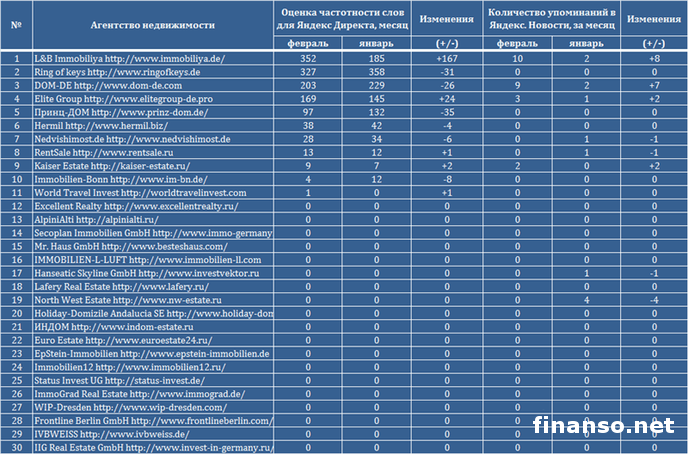 Одним из самых развитых в Евросоюзе является рынок недвижимости Германии. Достаточно высоким, по мнению экспертов, остается здесь потенциал роста. Гораздо больший доход, чем многие высоколиквидные инструменты, приносят вложения в обычное немецкое жилье. Рейтинг популярности агентств, предлагающих российским клиентам покупку недвижимости в Германии, определяло издание для инвесторов и трейдеров «Биржевой лидер». С январскими показателями сравнивались данные за февраль 2015 г. Этим вопросом интересовались корреспонденты издания «