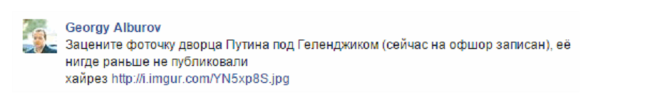 Как передают корреспонденты издания «Украина сегодня: Finanso.net», снимок дворца Путина на своей странице в социальной сети Facebook разместил сотрудник Фонда борьбы с коррупцией, соратник российского оппозиционера Алексея Навального Георгий Албуров. В это же время Албуров прокомментировал свой снимок так: «Зацените фотографию дворца Владимира Путина под Геленджиком. Такого снимка ранее нигде и никто не публиковал». Насколько известно, в конце 2010 года впервые стало известно о роскошном дворце. Тогда Сергей Колесников, партнер петербургских друзей нынешнего президента РФ Владимира Путина, написал открытое письмо тогдашнему российскому лидеру Дмитрию Медведеву о том, что на берегу Черного моря возле курортного города Геленджик в поселке Прасковеевка, что в Краснодарском крае России, начиная с 2005 года строится комплекс зданий для Путина. Стоимость постройки оценивается в миллиард американских долларов. Также он отметил, что на это строительство тратятся деньги из бюджета России. Тогда Колесников назвал формальным владельцем комплекса друга Путина Николая Шаламова. А спустя 6 лет после начала строительства, в 2011 году, резиденция была продана кипрской компании, бенефициаром которой является Александр Пономаренко, являющийся бизнесменом и деловым партнером Аркадия Ротенберга, также друга Владимира Путина. Параметры дворца.Особняк построен в стиле неоклассицизма с садом правильной формы, о чем говорится в расследовании Reuters. Известно, что в комплекс, площадь которого составляет 87 гектаров, со сметой 700-800 миллионов долларов США входит дворец площадью две тысячи метров квадратных. Примечательно, что по своим параметрам построение выдерживает землетрясение в 9 баллов. Также в дворец включены спорткомплекс, театр, амфитеатр, три вертолетных площадки и чайный домик. К пляжу и морю ведет девяностометровая лифтовая шахта, от которой отходит тоннель чуть меньшей длины, выполняющий также и функцию «элементов гражданской обороны», то есть бункера. Помимо всего прочего на территории «дворца Путина» расположен трехэтажный винозавод с шато и виноградниками. |