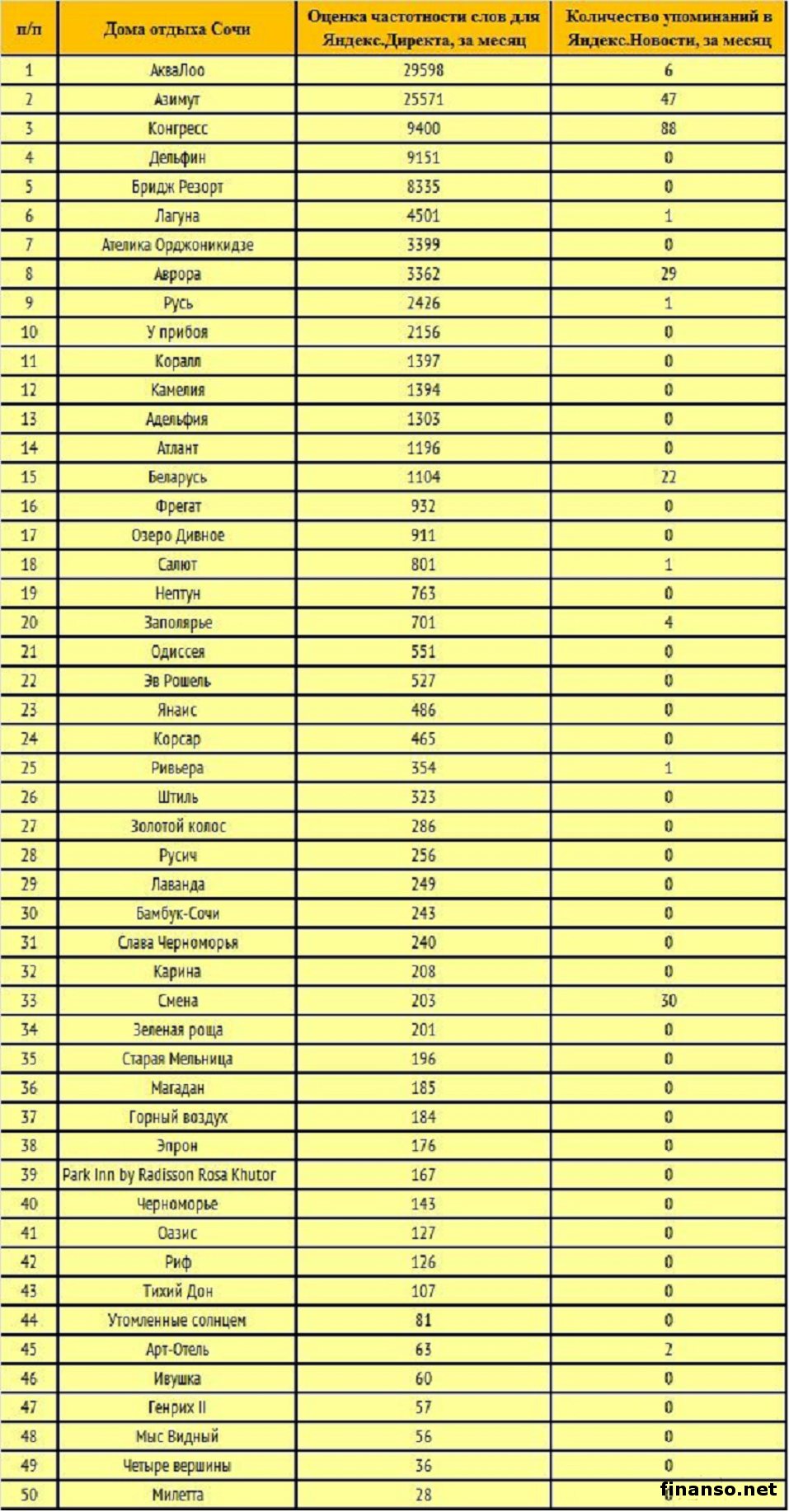 Каждый год Сочи уже в мае месяце открывает свои двери для туристов. Сочи не даром называют «жемчужиной» российского Причерноморья России. Досуг в этом городе открывает перед всеми гостями множество возможностей. «Ведь в наше время это цивилизованный курортный город», - констатируют журналисты издания «Украина сегодня: Finanso.net». Какие из домов отдыха, отелей Сочи самые популярные у россиян, пытались узнать журналисты «Биржевого лидера». Рейтинг известности сочинских домов отдыха в марте 2015 года.Рейтинг от аналитиков издания по экономике «Биржевой лидер» был создан на основе важных показателей: - общее число запросов в системе поиска Яндекс (демонстрирует, о каких отелях известно туристам); - общее число упоминаний в агрегаторе Яндекс.Новости (демонстрирует, какими отелями проводится самая эффективная пиар-политика); - регион анализа – РФ. ![]() Бесспорный лидер популярности в Сети – «АкваЛоо» со своими 29 598 запросами в системе поиска Яндекс. Это известный российский санаторно-курортный комплекс, что обладает большим выбором услуг, развитой инфраструктурой, солидным номерным фондом, универсальными возможностями для ведения спортивных мероприятий, фестивалей, конференций, выставок, деловых встреч, свадебных торжеств, банкетов, корпоративов и тому подобное. В «АкваЛоо» находится многопрофильный санаторий и пансионат. Там можно отдохнуть, пройти специальный курс реабилитационно-восстановительного лечения. Второе место досталось по праву дому отдыха «Азимут», у него за месяц зафиксирован 25 571 запрос в системе поиска Яндекс. В этом доме отдыха представлено 720 современных удобных номеров разных категорий, включая и для людей с ограниченными возможностями. Из окон всех номеров открывается шикарный вид на море и величественные Кавказские горы. Закрывает ТОП-3 лидеров отель «Конгресс» со своими 9 400 запросами в системе поиска Яндекс за последний месяц. Здесь можно отыскать все необходимое, дабы отвлечься от забот, окунуться в атмосферу полного блаженства. К услугам гостей зимние и летние кафе, спортивная площадка, благоустроенный пляж, множество баров и многое другое. Менее популярны: - Дельфин – 9151 запрос в Яндексе за месяц; - Бридж Резорт – 8335 запросов в Яндексе за месяц; - Лагуна – 4501 запрос в Яндексе за месяц; - Ателика Орджоникидзе – 3399 запросов в Яндексе за месяц; - Аврора – 3362 запроса в Яндексе за месяц; - Русь – 2426 запросов в Яндексе за месяц; - У прибоя – 2156 запросов в Яндексе за месяц; - Коралл – 1397 запросов в Яндексе за месяц; - Камелия – 1394 запроса в Яндексе за месяц; - Адельфия – 1303 запроса в Яндексе за месяц; - Атлант – 1196 запросов; - Беларусь – 1104 запроса в Яндекс. |