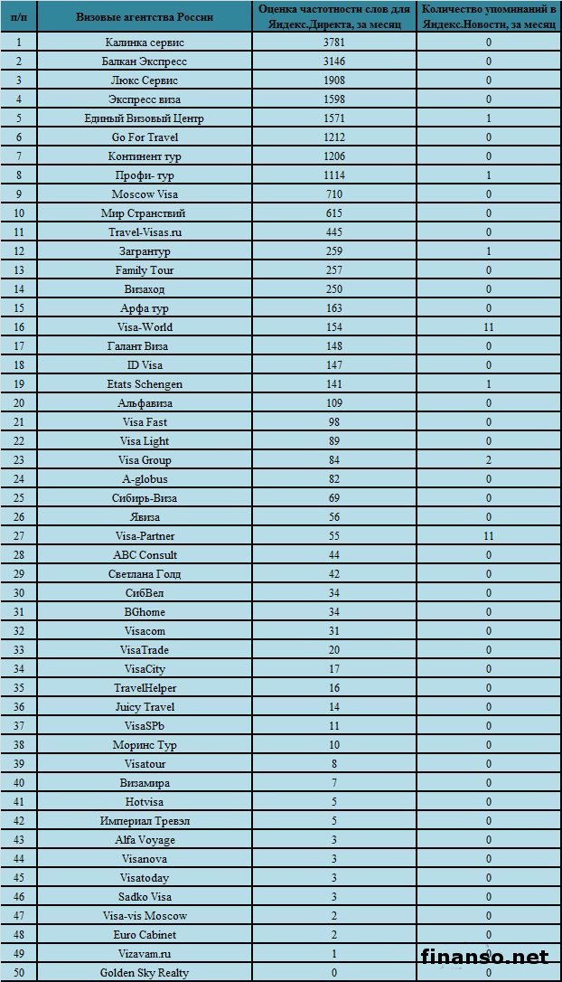 Небольшой уикенд или заранее спланированный отпуск – каждому туристу хочется использовать максимум возможностей, при этом потратив минимум денег и усилий. Однако решить все проблемы, которые связаны с оформлением необходимой документации для выезда за границу самому крайне трудно. Дабы не испортить путешествие, на помощь приходят различные визовые агентства, берущие на себя ключевые вопросы. Об этом рассказывают журналисты издания «Украина сегодня: Finanso.net». К настоящему моменту времени в Российской Федерации существует достаточно большое число разного рода визовых агентств. И как среди этого разнообразия выбрать надежного и честного партнера? Ответ на этот вопрос отыскали специалисты информационно-аналитического издания «Биржевой лидер», составив специальный рейтинг наиболее известны визовых агентств. Рейтинг популярности визовых агентств в поисковой системе Яндекс.![]() Рейтинг сформирован по двум показателям: - число запросов интернет-пользователей по визовым агентствам в системе Яндекс; - число упоминаний в СМИ Яндекс.Новости по этим же фирмам; - регион анализа – РФ: Лидер популярности на рынке – агентство «Калинка сервис» – со своими 3 781 запросом в системе Яндекс. Компания занимается оформлением виз, организацией групповых, частных деловых и туристических поездок. Второе не менее почетное место отдано по праву визовому агентству «Балкан Экспресс», у него 3 146 запросов в Яндексе за последний месяц. Это главный федеральный туристический оператор по Балканам, что за 20 лет работы расширил свой спектр предоставляемых услуг, геограницы своей деятельности. Третье место рейтинга на этот раз отвевало визовое агентства «Люкс Сервис» с 1 908 запросами в системе поиска Яндексе за последние 30 дней. Эта компания осуществляет на профессиональном уровне оформление разрешений на въезд в государства Шенгенского соглашения. Фирма специализируется на выдаче виз последние 10 лет, профессиональные эксперты обладают огромным опытом сотрудничества со всеми консульствами. Далее в рейтинге расположились такие визовые агентства: - Экспресс виза – 1 598 запросов в Яндексе; - Единый Визовый Центр - 1 571 запрос в Яндексе; - Go For Travel – 1 212 запросов в Яндексе; - Континент тур – 1 206 запросов в Яндексе; - Профи- тур - 1 114 запросов в Яндексе; - Moscow Visa – 710 запросов в Яндексе; - Мир Странствий – 615 запросов в Яндексе; - Travel-Visas.ru – 445 запросов в Яндексе; - Загрантур – 259 запросов в Яндексе; - Family Tour – 257 запросов в Яндексе; - Визаход – 250 запросов в Яндексе; - Арфа тур – 163 запроса в Яндексе. |