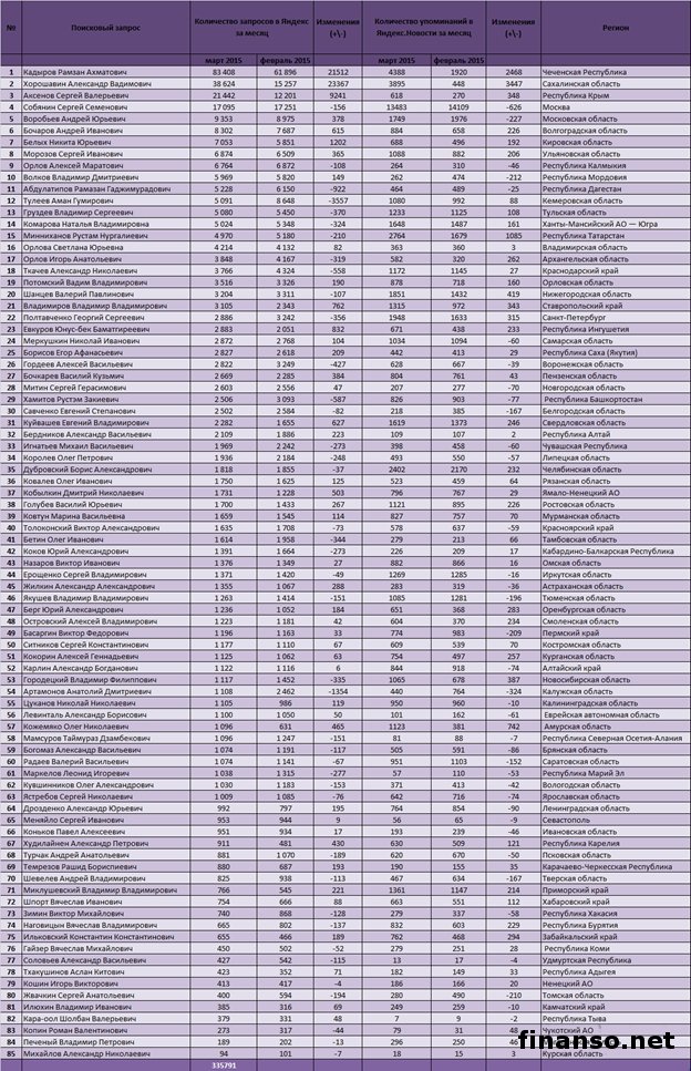 Современные политические деятели Российской Федерации сильно заботятся о своей личной репутации, своем пиаре. Хотя этим они совсем не отличаются от нынешних политиков разных иных уголков всего земного шара. А все потому, что имя действующего политика всегда должно быть, так сказать, на слуху. В противном случае ему попросту не «светит» очередное переизбрание. Большей части политических деятелей совсем уж не так и важно, в каком именно свете они упоминаются, потому что главное - это пиар. Есть большое количество тех, кто ведет свои специальные блоги для того, чтобы все обычные жители государства тщательно следили чуть ли не за каждым их шагом. Все это приносит политику достаточно высокую популярность. Об этом рассказывают корреспонденты издания онлайн «Украина сегодня: Finanso.net».Кто из сегодняшних российских региональных глав оказался самым известным в числе наиболее активных пользователей Глобальной сети Интернет? Ответ на этот вопрос попытались отыскать специалисты информационно-аналитического издания «Биржевой лидер». Наиболее цитируемые губернаторы РФ в Сети.Рейтинг цитируемости российских региональных глав был составлен на основании трех основных критериев: - оценка частотности слов для системы Яндекс.Директ за 30 дней, что рассчитывалась с помощью сервиса wordstat.yandex.ru; - частота упоминаний о главах регионов, что рассчитывается при помощи агрегатора news.yandex.ru (Яндекс.Новости); - регион анализа (а значит, поиска в специальном сервисе wordstat.yandex.ru) – РФ. Из данных таблицы понятно, что: ![]() - первое место по известности из числа региональных российских глав занимает по праву Рамзан Ахматович Кадыров, глава Чеченской Республики РФ. Именно по нему было произведено наибольшее число запросов в марте этого года (83 408 запросов в Яндекс); - второе место отдано на этот раз главе российской Сахалинской области Хорошавину Александру. У него зафиксировано 38 624 запроса в системе поиска Яндекс; - ТОП-3 лидеров на этот раз закрывает глава Крымского полуострова Сергей Аксенов. По нему за последний месяц было произведено 21 442 запроса. Далее расположились такие главы регионов: Никита Юрьевич Белых; Юнус-бек-Баматгиреевич Евкуров; Владимир Владимирович Владимиров; Евгений Владимирович Куйвашев; Андрей Иванович Бочаров; Дмитрий Николаевич Кобылкин; Олег Николаевич Кожемяко; Александр Петрович Худилайнен; Василий Кузьмич Бочкарев; Андрей Юрьевич Воробьев; Сергей Иванович Морозов. |