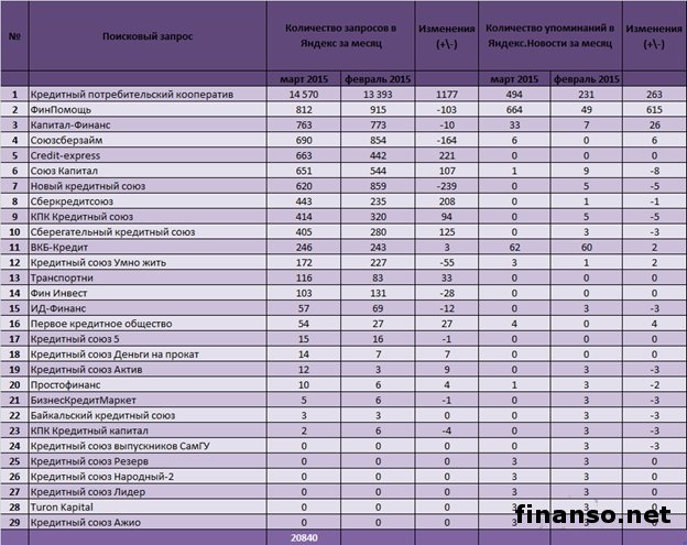 Из-за довольно сложной экономической ситуации, сформировавшейся в России в связи с введением санкций западными государствами, гражданам этой страны пришлось всерьез на себе ощутить дефицит денежных средств. Зависимо от прибыли семьи, многие из них могут еще вполне достойно выходить из положения, начав попросту больше себя ограничивать во многом. «При этом остальные вынуждены обращаться к разным финансовым организациям, дабы взять хотя бы небольшой денежный кредит», - констатируют журналисты экономического издания «Украина сегодня: Finanso.net». В связи с этим в наше время кредитные союзы в стране быстро стали набирать популярность. Весомым фактором для этого также стал отказ большинства банковских учреждений в кредитовании физлиц или же существенное ужесточение условий по их выдаче. Самые первые кредитные союзы во всем мире начали появляться в конце XIX- начале XX столетий. Таким образом, на данный момент времени они довольно широко распространены в 88 государствах мира. Это финансовые некоммерческие организации, которые специализируются на финансовой взаимопомощи посредством предоставления ссудо-сберегательных услуг всем членам. Какие кредитные союзы самые известные у граждан Российской Федерации? Ответ на этот вопрос искали аналитики портала по экономике и финансам «Биржевой лидер». Рейтинг известности кредитных союзов у россиян за март 2015 года.Рейтинг составлен по двум объективным, прозрачным показателям, что помогут в выборе организации: - количество вводимых запросов в Яндекс за месяц (регион поиска – РФ); - количество упоминаний компании в СМИ, в интернет-изданиях агрегатора новостей Яндекс.Новости; Самые известные кредитные союзы РФ.Первое место - это Кредитный потребительский кооператив, по которому граждане Российской Федерации из числа самых активных пользователей сети Интернет произвели за последний месяц самое большое число запросов (14 570) в системе поиска Яндекс. - ФинПомощь – 812 запросов в Яндекс за месяц; - Капитал-Финанс – 763 запроса в Яндекс за месяц. Аутсайдерами признаны: - Кредитный союз выпускников СамГУ – 0 запросов в Яндекс за месяц; - Кредитный союз Резерв – 0 запросов в Яндекс за месяц; - Кредитный союз Народный-2 – 0 запросов в Яндекс за месяц; - Кредитный союз Лидер – 0 запросов в Яндекс за месяц; - Turon Kapital – 0 запросов в Яндекс за месяц; - Кредитный союз Ажио – 0 запросов в Яндекс за месяц. |
