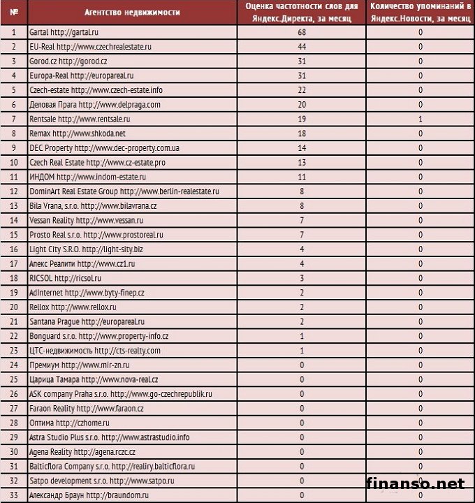 Рынок чешской недвижимости характеризуется продолжающимся последние семь лет снижением цен, падением интереса к нему со стороны заграничных покупателей. Однако несмотря на это, граждане Росси и дальше активным образом продолжают приобретать недвижимость. Больше всего это касается Праги и Карловых Вар. Специалисты говорят: «Ценовая категория объектов явно отличается в зависимости от их местонахождения. В регионах, где замечен сниженный уровень безработицы, объекты недвижимости находят своих клиентов по достаточно высоким ценам при сравнении с ценами в регионах с более слабой экономикой. Подробностями интересовались корреспонденты издания «Украина сегодня: Finanso.net». Специалисты экономического портала «Биржевой лидер» подготовили свежий рейтинг известности чешских агентств недвижимости в глобальной сети Интернет. Рейтинг известности АН Чехии в Сети.Рейтинг издания онлайн «Биржевой лидер» опирается на два вполне объективных критерия в системе поиска Яндекс: - оценка частотности слов для системы Яндекс.Директ за один месяц, что рассчитана при помощи сервиса wordstat.yandex.ru; - число упоминаний за то же самое время об агентстве недвижимости в онлайн-СМИ, электронных информагентствах, что рассчитано с помощью агрегатора Яндекс.Новости (news.yandex.ru); - регион оценки - РФ: 1. Первое место досталось компании «Gartal» с результатом в 68 запросов с территории РФ. Она оказывает большой спектр услуг по продаже, покупке, сдаче в аренду жилья в Чехии, предоставляет услуги по оформлению ипотечных кредитов. Также данное агентство жилья предлагает квалифицированную поддержку в вопросах, что касаются иммиграции, запуска бизнеса на территории Чехии. 2. Второе место заслуженно в апреле досталось фирме «EU-Real» с 44 запросами из РФ. Фирма занимается покупкой и продажей элитного чешского жилья, предлагает полное сопровождение сделок, целый комплекс сопутствующих услуг. 3. Закрывает ТОП-3 лидеров рейтинга компания «Gorod.cz» со своим 31 запросом за последний месяц. Фирма предлагает сервис по приобретению, сдаче в аренду жилья в Чехии. Для удобства выбора данная фирма сформировала самый большой русскоязычный каталог чешской недвижимости, куда входит более 6000 объектов. В ТОП-10 лидеров рейтинга попали: - Europa-Real – 31 запрос в Яндекс; - Czech-estate – 22 запроса в Яндекс; - Деловая Прага – 20 запросов в Яндекс; - Rentsale – 19 запросов в Яндекс; - Remax -18 запросов в Яндекс; - DEC Property – 14 запросов в Яндекс; - Czech Real Estate – 13 запросов в Яндекс; - Индом – 11 запросов в Яндекс. |