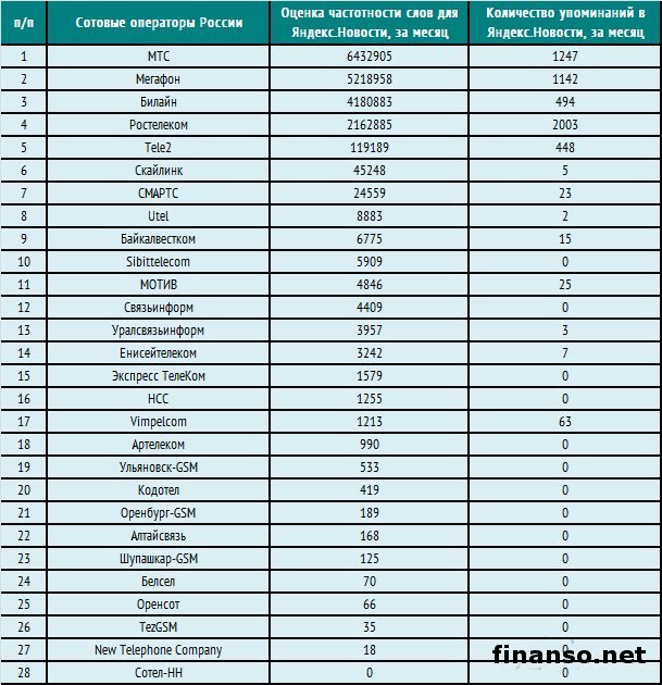 На данный момент времени на территории Российской Федерации презентовано большое количество сотовых операторов. В связи с этим перед потенциальными пользователями встает весьма важный выбор. У каждого оператора мобильной связи есть свои наиболее выгодные предложения, услуги и тарифные пакеты. Именно это всерьез усложняет выбор самого пользователя. Однако эксперты онлайн-издания по новостям для трейдеров издания издания «Украина сегодня: Finanso.net» решили четко разобраться в данном вопросе, слегка упростив сам процесс выбора пользователей. «Мегафон» и «МТС» - наиболее известные мобильные операторы в РФ.Рейтинг популярности мобильных операторов был сформирован журналистами информационно-аналитического издания «Биржевой лидер» по двум важным критериям: - оценка частотности слов для системы Яндекс.Директ за один месяц, что была рассчитана при помощи специального сервиса wordstat.yandex.ru; - частота упоминаний об операторах, что рассчитана с помощью агрегатора news.yandex.ru (Яндекс.Новости); - регион анализа (следовательно, поиска в сервисе wordstat.yandex.ru) – РФ. Первое почетное место рейтинга известности отдано по праву мобильному оператору «МТС». Именно по нему за прошлый месяц было произведено максимальное число запросов в системе поиска Яндекс со стороны жителей РФ - 6 432 905 запросов. Корпорация МТС самого начала специализировалась на предоставлении услуг связи лишь в столичном районе. В процессе развития компания начала активно скупать региональных операторов. Сейчас она стала лидером на рынке мобильной связи в РФ. В зону покрытия МТС в ближнем зарубежье попали также Беларусь, Армения, Туркменистан. Второе не менее почетное место отдано российскому мобильному оператору «МегаФон», по нему граждане РФ в минувшем месяце произвели 5 218 958 запросов в системе поиска Яндекс. На рынке сотовой святи компания работает с 1993 года. В первый раз фирма предложила абонентам выбор из списка тарифных планов в начале 21 века. Чуть позже оператор в числе первых предложил клиентам услугу MMS и в РФ, и в Европе. Теперь оператор считается вторым по количеству абонентов в государстве, лидером по территории покрытия в Московском регионе. Третье место досталось оператору сотовой связи «Билайн», что в сентябре нынешнего года заинтересовал россиян 4 180 883 раза. В 2004 году компания стала самым первым оператором из России, внедрившим технологию EDGE. Сейчас самую большую зону покрытия имеет как раз «Билайн» - мобильная связь распространена в странах ближнего зарубежья: Казахстан, Армения, а также Таджикистан. В прошлом месяце жители РФ проявили интерес к таким операторам: Ростелеком – 2 162 885 запросов в Яндексе за месяц; - Tele2 – 119 189 запросов в Яндексе за месяц; - Скайлинк – 45 248 запросов в Яндексе за месяц; - СМАРТС – 24 559 запросов в Яндексе за месяц; - Utel – 8 883 запроса в Яндексе за месяц; - Байкалвестком – 6 775 запросов в Яндексе за месяц; - Sibirtelecom – 5 909 запросов в Яндексе за месяц. |