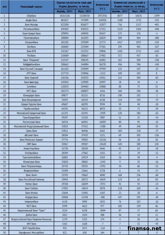 К настоящему моменту времени компании, которые специализируются на предоставлении финансовых услуг, считаются фактически незаменимыми. А все по той простой причине, что они выполняют все наиболее значимые, нужные для нормальной жизнедеятельности функции. Кроме того, они также помогают сохранению, росту финансовых накоплений российских граждан. Однако далеко не всем хочется, не каждый готов доверить личные финансовые средства денежным учреждениям. Исходя из этого простого факта, для российских граждан крайне важен грамотный и эффективный пиар. Подробностями интересовались корреспонденты издания «Украина сегодня: Finanso.net».Какие именно банковские учреждения современного типа проводят самую результативную рекламную кампанию? Какие из них считаются наиболее известными в списке граждан РФ? Ответ на этот простой вопрос пытались отыскать специалисты информационного портала «Биржевой лидер». Сбербанк России – лидер в числе компаний, которые предоставляют финансовые услуги в глобальной сети.Рейтинг издания опирается на два вполне объективных критерия в системе поиска Яндекс: - оценка частотности слов для Яндекс.Директа за один месяц, что рассчитана при помощи сервиса wordstat.yandex.ru; - число упоминаний за то же самое время о банке в онлайн-СМИ, информационных электронных агентствах, что рассчитано с помощью агрегатора Яндекс.Новости (news.yandex.ru); - регион оценки – Российская Федерация. Лидерство в числе фирм, которые предоставляют финансовые услуги, в текущем месяце по праву занимает Сбербанк. За долгие годы своей деятельности именно это банковское учреждение смогло в полной мере доказать свою оперативность, надежность, профессионализм, качество. Он отличается обширной филиальной сетью. Это дает возможность клиентам обслуживаться почти в любом уголке государства. Второе место в рейтинге известности принадлежит Банку Москвы, входящий в список самых больших учреждений российского финансового рынка, что держит по контролем более трехсот представительств. Банк Москвы предлагает большой список услуг для физических и для юридических лиц. Третье не менее почетное место на этот раз по праву досталось Альфа-Банку, который действует на рынке государства с 1990 года. Сейчас этот банк собой представляет универсальное финансово-кредитное учреждение, которое производит самые важные банковские операции. |