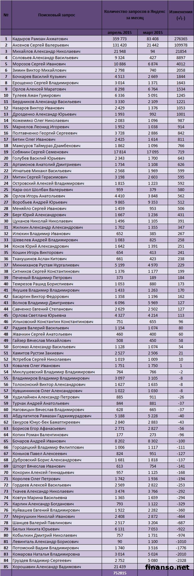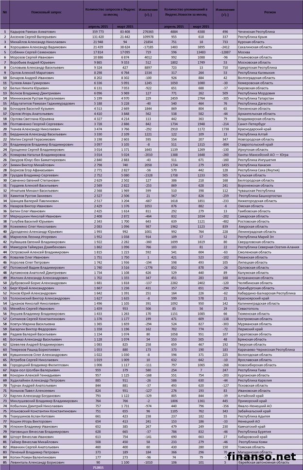 Политики должны все время тщательно заботиться о личной популярности, в противном случае им просто не «светит» переизбрание. При этом быстрое развитие глобальной сети Интернет стало отличным вариантом для поддержания популярности политических деятелей из разных уголков всего земного шара. Многие политики заводят свои блоги, странички в соцсетях, пытаются засветиться в СМИ. И все это делается исключительно для того, чтобы их обсуждали, о них говорили, ими интересовались, их никогда не забывали. Подробностями интересовались корреспонденты издания «Украина сегодня: Finanso.net».Кто из нынешних региональных российских глав признан самым известным среди активных пользователей сети Интернет? Ответ на этот вопрос уже знают журналисты информационно-аналитического сайта «Биржевой лидер». Наиболее цитируемые губернаторы России в Сети за май 2015 года.Рейтинг цитируемости российских глав регионов был сформирован на основании трех основных критериев: - оценка частотности слов для системы Яндекс.Директ за последние 30 дней, что рассчитывается с помощью сервиса wordstat.yandex.ru; - частота упоминаний о губернаторах, что рассчитана при помощи агрегатора news.yandex.ru (Яндекс.Новости); - регион анализа (то есть поиска в сервисе wordstat.yandex.ru) – Россия. Показатели таблицы показывают: - первое почетное место по известности среди глав регионов РФ занимает Рамзан Ахматович Кадыров – нынешний глава Чеченской Республики. Именно по нему было за месяц произведено наибольшее число запросов - 359 773 запроса; - второе место отдано главе российского региона Сергею Валерьевичу Аксенову. У него отмечено за месяц 131 420 запросов в системе поиска Яндекс; - ТОП-3 лидеров закрывает Александр Николаевич Михайлов. По нему было за месяц успешно произведено 21 948 запросов. Какие изменения зафиксированы в апреле 2015 года?Уровень известности российских губернаторов напрямую зависит от принятых ими решений, а также активности в области пиар, рекламы и иных подобных факторов. Каким же образом поменялись показатели общего числа запросов за апрель этого года в сравнении с прошлым месяцем? 1. Лидер рейтинга по росту числа запросов - Рамзан Ахматович Кадыров, у него отмечено плюс 276 365 запросов в системе поиска Яндекс. 2. Наиболее серьезное снижение показателя замечено у Александра Вадимовича Хорошавина – это минус 17 185 запросов за один месяц. |