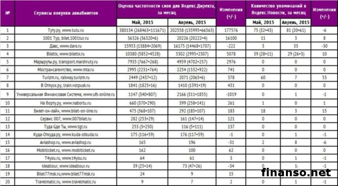 Многие россияне в момент приобретения авиационных билетов часто сталкивались с трудностями, одной из которых считается терпеливое ожидание в течение нескольких часов в большой очереди. В нашем мире информтехнологий о данной проблеме можно и забыть. Сейчас многие путешественники имеют возможность выбрать подходящий сервис приобретения билетов на самолет в самое удобное время, не выходя из дома. На территории РФ подобных сервисов есть достаточно много, а значит, есть и разнообразие выбора. Подробностями интересовались корреспонденты издания «Украина сегодня: Finanso.net». Однако как разобраться, выбрать для себя самый надежный и удобный сервис? Какие из них пользуются самый большой известностью у жителей РФ? С этим вопросом подробно решили разобраться аналитики портала «Биржевой лидер».Рейтинг популярных сервисов покупки авиабилетов в Интернете.Рейтинг известности сервисов приобретения авиационных билетов формировался на базе таких важных критериев: - оценка частотности слов для системы поиска Яндекс.Директа за месяц, что рассчитана при помощи сервиса wordstat.yandex.ru; - частота упоминаний о сервисах, что рассчитана с помощью агрегатора news.yandex.ru (Яндекс.Новости); - регион анализа (то есть поиска в сервисе wordstat.yandex.ru) – РФ. Место лидера в рейтинге самых известных сервисов продаж авиационных билетов принадлежит фирме Tutu.ru (202 558 запросов в поисковой системе Яндекс за последний месяц), при помощи которой можно узнать четкое расписание электричек, отыскать карту метро, заказать нужные билеты. Второе, не менее почетное место досталось фирме 1001 «Тур» (20 226 запросов в Яндексе за месяц), которая предоставляет услуги покупки-продажи авиационных билетов и бронирования отелей пользователям. Третье место в рейтинге отдано по праву ведущему сервису «Давс» (16 175 запросов в поисковой системе Яндексе за один месяц), благодаря которому можно не только заказать билеты на самолет или на поезд, но и организовать деловые или индивидуальные туры. Аутсайдерами рейтинга в текущем месяце стали: - «Сервис 007» – 282 запроса в Яндексе; - «Туда Gде Ты» – 253 запроса; - «Куда-Откуда.ру» – 175 запросов; - «Aviashop.ru» – 165 запросов; - «Mobiticket.ru» – 162 запроса; - «T4you.ru» – 64 запроса; - «Idealtour» – 39 запросов; - «Bilet77msk.ru» – 24 запроса; - «Travelmatic.ru» – 9 запросов, по данным брокера Forex-Market.44 |