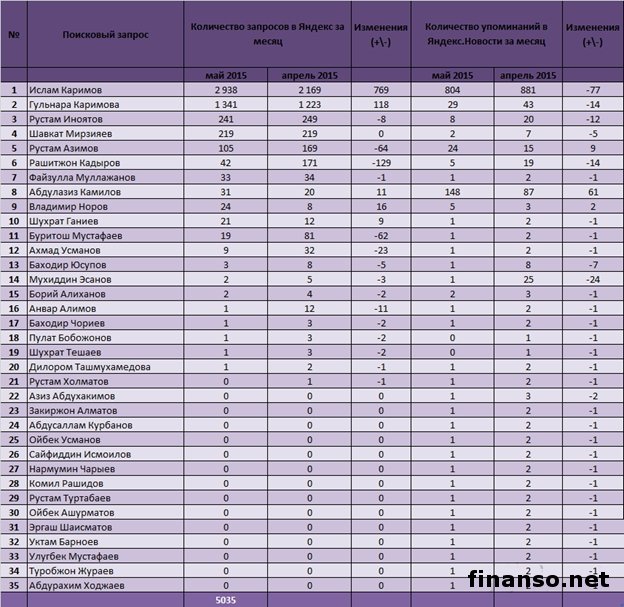 Публичные люди всегда на виду, их имидж и рейтинг имеют большое значение. По этой простой причине они уделяют довольно много внимания своему пиару, который может показать их самые лучшие стороны. Для этого сами политики привыкли использовать разные методы продвижения в Глобальной сети, соцсетях, на ТВ. Кроме того, исключением не стали и узбекские политические деятели. Подробностями интересовались корреспонденты издания «Украина сегодня: Finanso.net». Но какой именно нынешний узбекистанский политик на данный момент времени считается самым известным? Ответ на этот вопрос активно искали журналисты издания по экономике и предпринимательству «Биржевой лидер».Рейтинг популярности политиков РУ в сети за май 2015 года.Рейтинг был сформирован по двум вполне объективным, прозрачным показателям, что помогут в вопросе выбора политика. Это: - общее количество вводимых запросов в систему поиска Яндекс за один месяц (регион поиска – Узбекистан); - количество упоминаний о том или ином политике в масс-медиа, то есть в онлайн-изданиях агрегатора новостей в системе Яндекс.Новости; - регион поиска – Узбекистан. Таблица показывает:- место лидера досталось на этот раз узбекским политикам во главе с президентом страны Исламом Каримовым. Именно по нему было произведено самое большое число запросов за месяц - 2 938 запросов в Яндексе за май 2015 года; - второе место - Гульнаре Каримова со своими честно заработанным 1 341 запросом. Она, как известно, сейчас является председателем попечительского совета Фонда «Форум культуры и искусства РУ». В минувшем году у Гульнары Каримовой начались серьезные проблемы с ее политическими амбициями, желанием стать главой державы, она попала под домашний арест; - Топ-3 лидеров закрывает Рустам Иноятов, действующий председатель Службы нацбезопасности РУ. Именно по нему и был произведен 241 запрос гражданами Республики Узбекистан в системе поиска Яндекс. Далее следуют такие политические деятели: - Шавкат Мирзияев – 219 запросов в Яндекс; - Рустам Азимов – 105 запросов в Яндекс; - Рашитжон Кадыров – 42 запроса в Яндекс; - Файзулла Муллажанов – 33 запроса в Яндекс; - Абдулазиз Камилов – 31 запрос в Яндекс; - Владимир Норов – 24 запроса в Яндекс; - Шухрат Ганиев – 21 запрос в Яндекс; - Буритош Мустафаев – 19 запросов в Яндекс; - Ахмад Усманов – 9 запросов в Яндекс; - Баходир Юсупов – 3 запроса в Яндекс; - Мухиддин Эсанов – 2 запроса в Яндекс; - Борий Алиханов – 2 запроса в Яндекс; - Анвар Алимов – 1 запрос в Яндекс; - Баходир Чориев – 1 запрос в Яндекс; - Пулат Бобожонов – 1 запрос в Яндекс; - Шухрат Тешаев – 1 запрос в Яндекс. |