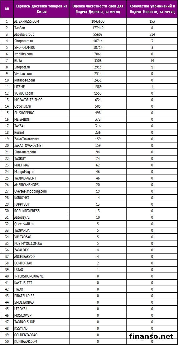 На прилавках нынешних магазинов презентован огромный выбор товаров из Китая разных производителей. Однако часто бывает крайне сложно отыскать быстро нужный предмет в числе столь серьезного разнообразия. По этой простой причине альтернативой становятся торговые онлайн-площадки Китая, при помощи которых можно не просто отыскать товары на любой вкус, но так же просто их можно заказать с доставкой прямо на дом. Подобных сервисов в России существует много, то есть разнообразие выбора налицо. Подробностями интересовались корреспонденты издания «Украина сегодня: Finanso.net». Однако как же четко понять, выбрать для себя самый надежный и удобный сервис? Какие из этих сервисов сейчас пользуются самой большой известностью у российских жителей? Ответ на этот вопрос пытались отыскать специалисты журнала «Биржевой лидер». Рейтинг известных сервисов доставки товаров из КНР в Сети.Рейтинг известности сервисов доставки китайских товаров был сформирован на основе нескольких критериев: - оценка частотности слов для системы Яндекс.Директ за один месяц, что рассчитана при помощи специального сервиса wordstat.yandex.ru; - частота упоминаний о сервисах, что рассчитана посредством агрегатора news.yandex.ru (Яндекс.Новости); Первое почетное место рейтинга самых известных сервисов принадлежит фирме ALIEXPRESS (1 043 600 запросов в системе поиска Яндексе за последний месяц). С его помощью можно купить товары из Китая, включая ПК технику, одежду, электронику, автотовары, а также инструменты и многое иное. Второе не менее почетное место досталось на этот раз по праву сервису фирмы «Таобао» (177 419 запросов в системе поиска Яндекс за последний месяц). Этот сервис собой представляет каталог китайских товаров от разных реализаторов. Проплачивать товары можно не покидая родного дома через банковскую карту. Топ-3 лидеров закрывает фирма Alibaba Group (55 603 запроса в системе поиска Яндекс за последний месяц) – это главный сервис по доставке китайских товаров, благодаря которому можно купить разные товары в онлайн-режиме. Далее сервисы доставки товаров из Китая расположились в рейтинге популярности следующим образом: - Shopotam.ru - 10 714 запросов в Яндексе за месяц; - Izobility.com – 7 061 запрос в Яндексе за месяц; - RUTA – 3 506 запросов в Яндексе за месяц; - Shopozz.ru – 2 915 запросов в Яндексе за месяц; - Vivatao.com – 2 514 запросов в Яндексе за месяц; - Rutaobao.com – 2 431 запрос в Яндексе за месяц. |