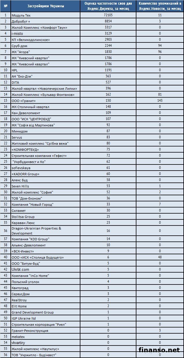В связи с продолжающимися проблемами в украинской экономике, сложным военным положением, спрос на жилье в государстве резко снизился, больше всего это касается восточных регионов. В связи с этим положение застройщиков на рынке также оказалось достаточно шатким. Самыми привлекательными считаются в настоящее время объекты в прибрежной курортной зоне государства и недвижимость в крупных городах. Подробностями интересовались корреспонденты издания «Украина сегодня: Finanso.net». Но поменялся ли интерес российских граждан к недвижимости, насколько известны застройщики в числе пользователей российской глобальной сети Интернет? Дать ответы на эти и другие подобные вопросы помогает рейтинг, который сформирован специалистами информационно-аналитического издания «Биржевой лидер». В этом случае сравнивались показатели февраля и марта этого года. Лидеры известности в сети в числе застройщиков Украины.Рейтинг издания «Биржевой лидер» опирается на два объективных критерия в системе поиска Яндекс: – оценка частотности слов для системы поиска Яндекс.Директ за месяц, что рассчитана при помощи сервиса wordstat.yandex.ru; – число упоминаний за то же самое время о застройщиках в онлайн СМИ, электронных информагентствах, что рассчитано с помощью агрегатора Яндекс.Новости (news.yandex.ru); – регион оценки - Украина. Первое место досталось на этот раз по праву компании по строительству «Модуль Тех» (72 105 запросов за месяц в Яндексе), специализирующейся на строительстве объектов недвижимости. Фирма имеет огромный опыт возведения зданий: склады, турбазы, кемпинг, таунхаус, кафе, сельскохозяйственные, промышленные здания, а также коттеджный поселок. Ключевое направление работы фирмы – это каркасный дом под ключ. Второе не менее почетное место в рейтинге отдано по праву строительной и девелоперской фирме «Добробут +» (8 854 запроса за месяц в Яндексе). Эта быстро развивающаяся фирма активными темпами расширяет область деятельности, применяя все больше новых инвестинструментов, модернизируя систему управления. Компания опирается на внедрение передовых технологий в сфере строительства. Третье место - жилой Комплекс «Комфорт Таун» (3 317 запросов за месяц в Яндексе) – первый и единственный в стране проект, где территория, инфраструктурное наполнение, месторасположение, ценовая политика, архитектурное решение выбирались в границах единой, заранее подготовленной специальной концепции... Аутсайдеры: - Elit Home – 2 запроса; - RealStroy – 2 запроса; - IGP Ukraine ltd – 1 запрос; - Grand Development Group – 1 запрос; - Строительная корпорация «Риел» – 1 запрос. |