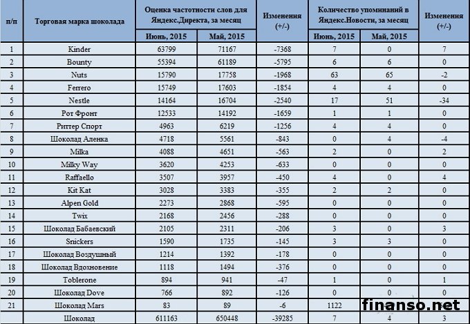 Большинство россиян неравнодушно относятся к шоколаду, считая его по праву самым лучшим лакомством. Ведь спрос на него все время быстро растет, производители год от года предлагают все более обширный выбор шоколадной продукции. У потребителя есть выбор: горький, белый, молочный, черный шоколад.По статистике ВЦИОМ, в Российской Федерации шоколаду отдают предпочтение порядка 79 процентов жителей. В связи с подобной огромной любовью потребителей шоколад занимает примерно 50 процентов всего кондитерского рынка. В то же время сам рынок РФ считается четвертым в мире после таких государств, как Германия, Великобритания и Америка. Но какие именно торговые марки шоколада в настоящее время пользуются самой большой известностью среди жителей России? Ответ на этот вопрос искали аналитики информационно-аналитического издания «Биржевой лидер». Подробностями интересовались корреспонденты издания «Украина сегодня: Finanso.net». Рейтинг известности ТМ шоколада в Интернете.Рейтинг издания «Биржевой лидер» сформирован на основании двух вполне объективных показателей: - общее число запросов в системе поиска Яндекс; - общее число упоминаний в системе поиска Яндекс.Новости за один месяц в качестве опережающего индикатора, показывающего, какие из брендов шоколада начинают серьезную пиар-кампанию, которая поможет им в ближайшее время подняться по общему количеству запросов; - регион поиска – РФ: Из табличных данных понятно, что самой большой известностью у граждан РФ пользуются такие ТМ шоколада: - Kinder – 63 799 запросов в Яндексе за месяц; - Bounty – 55 394 запроса в Яндексе за месяц; - Nuts – 15 790 запросов в системе поиска Яндекс за месяц; - Ferrero – 15 749 запросов в системе поиска Яндекс за месяц; - Nestle – 14 164 запроса в системе поиска Яндекс за месяц; - Рот Фронт – 12 533 запроса в системе поиска Яндекс за месяц; - Риттер Спорт – 4 963 запроса в системе поиска Яндекс за месяц; - Шоколад Аленка – 4 718 запросов в системе поиска Яндекс за месяц; - Milka – 4 088 запросов в системе поиска Яндекс за месяц; - Milky Way – 3 620 запросов. Аутсайдеры рейтинга популярности ТМ шоколада в текущем месяце: - Snickers – 1 590 запросов в системе поиска Яндекс за месяц; - Шоколад Воздушный – 1 214 запросов в системе поиска Яндекс за месяц; - Шоколад Вдохновение – 1 118 запросов в системе поиска Яндекс за месяц; - Toblerone – 894 запроса в системе поиска Яндекс за месяц; - Шоколад Dove – 766 запросов в системе поиска Яндекс за месяц; - Шоколад Mars – 83 запроса в системе поиска Яндекс за месяц. |