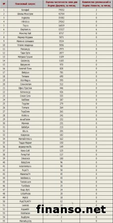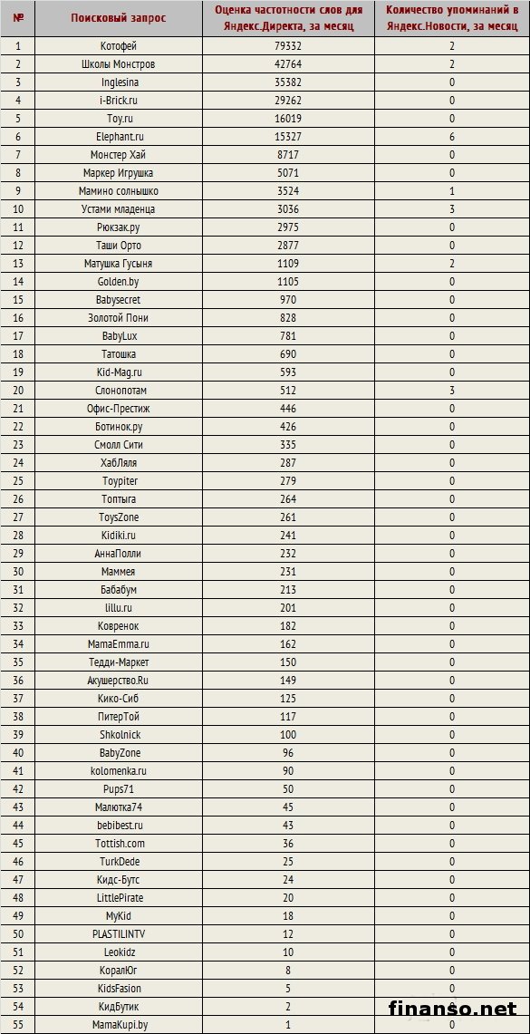 Ожидание и появление на свет малыша приносит в жизнь много радости, однако вместе с этим быстро появляются новые заботы. Родители, конечно же, очень хотят, чтобы у их малыша было все самое лучшее: и красивая и удобная кроватка, и лучшая коляска, и самое хорошее автокресло, и качественные игрушки. И это все в настоящее время можно купить через глобальную сеть Интернет в разных онлайн-магазинах. И дабы просто не растеряться в таком приятном многообразии и выбрать самую подходящую компанию, надо опираться на рейтинги, которые составляются специалистами издания «Биржевой лидер». Самые известные онлайн-магазины товаров для детей в Российской Федерации.Рейтинг известности онлайн-магазинов товаров для детей был сформирован на основе трех основных критериев: - оценка частотности слов для системы поиска Яндекс.Директ за месяц, что рассчитана при помощи сервиса wordstat.yandex.ru; - частота упоминаний о магазине в интернет-изданиях России, что рассчитана при помощи агрегатора news.yandex.ru (Яндекс.Новости); - регион анализа (то есть поиска в сервисе wordstat.yandex.ru) – РФ. Первое место лидера досталось на этот раз интернет-магазину детских товаров под названием «Котофей» (79 332 запроса за месяц в системе поиска Яндекс), что считается самым большим в области продажи товаров для детей. За счет налаженных связей с производителями фирма предлагает покупателям оптимальные цены, различные программы лояльности, помогающие клиентам делать наиболее выгодные покупки. На втором не менее почетном месте располагается интернет-магазин «Школы монстров» (42 764 запроса за месяц в системе поиска Яндекс), что предоставляет разного вида товары для детей. Ключевые преимущества сервиса - это вполне приемлемые цены, большой ассортимент, а также удобство приобретения и самые гибкие возможности доставки. Третья почетная позиция рейтинга известности принадлежит целой сети супермаркетов бытовой техники «Inglesina» (35 382 запроса за месяц в системе поиска Яндекс). Ассортиментный выбор сформирован из более чем 2 тысяч товаров главных мировых марок. Аутсайдеры известности среди онлайн-магазинов товаров для детей в РФ: - «MyKid» – 18 запросов в системе поиска Яндекс; - «PLASTILINTV» – 12 запросов в системе поиска Яндекс; - «Leokidz» – 10 запросов в системе поиска Яндекс; - «КоралЮг» – 8 запросов в системе поиска Яндекс; - «KidsFasion» – 5 запросов в системе поиска Яндекс; - «КидБутик» – 2 запроса в системе поиска Яндекс; - «MamaKupi.by» – 1 запрос в системе поиска Яндекс. |