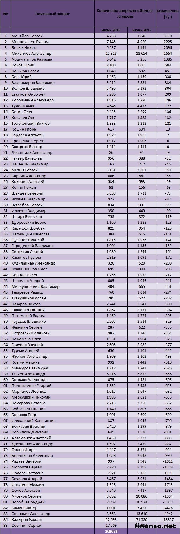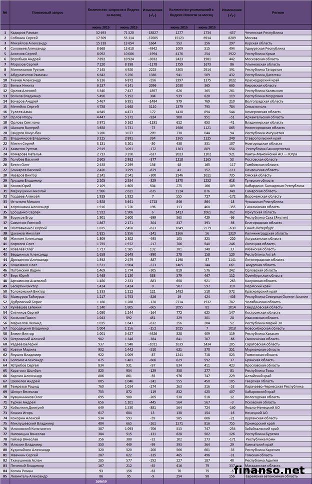 Сложившаяся на сегодняшний день политическая обстановка в государстве всегда считается ключевой темой обсуждения, вызывает множество вопросов и споров. Кто наиболее известный из российских глав регионов - это вопрос достаточно сложный, потому что современная политика предполагает не только мастерство исполнения президентских указов, Государственной думы и правительства губернаторами России. И тем не менее умение достучаться до сердец простых избирателей, стать авторитетным в своем регионе важно для каждого современного политика. Подробностями интересовались корреспонденты издания «Украина сегодня: Finanso.net». Также весьма сложной задачей зачастую становится формирование рейтинга региональных глав России при помощи вполне объективного критерия, что без особого труда можно выяснить и проверить, у кого из региональных глав снижается уровень известности, а у кого возрастает, и каковы причины этого. Кто из российских региональных глав оказался самым известным в числе пользователей глобальной сети Интернет? С этим вопросом решили четко разобраться аналитики информационно-аналитического издания для деловых людей «Биржевой лидер». Рейтинг цитируемости глав российских регионов формировался на основании трех основных критериев: - оценка частотности слов для системы поиска Яндекс.Директ за последний месяц, что рассчитана с помощью сервиса wordstat.yandex.ru; - частота упоминаний о главах регионов, что рассчитана при помощи агрегатора news.yandex.ru (Яндекс.Новости); - регион анализа (то есть поиска в сервисе wordstat.yandex.ru) – России. Из показателей таблицы понятно: - первое почетное место по известности среди российских глав регионов по праву занимает Рамзан Кадыров, глава Чеченской Республики, потому что по нему граждане России произвели самое большое число запросов за июль нынешнего года (53 693 запроса); - второе место отдано в июле месяце Сергею Собянину, главе города Москвы, с 17 509 запросами в системе поиска Яндекс; - третье место отдано по праву Александру Михайлову, глава российской Курской области, по которому произведено было 15 318 запросов в системе поиска Яндекс. Уровень известности российских губернаторов напрямую зависит от принятых решений, а также активности в области пиар, рекламы и иных подобных факторов. Вот как показатели общего числа запросов были изменены в середине этого года: |