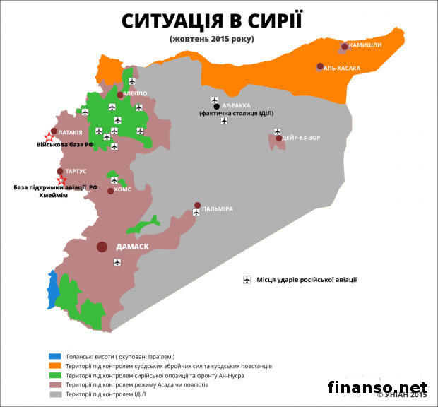 На опубликованных записях, как сообщается, якобы зафиксированы удары авиации РФ по району боевиков в провинции Хама, по базе приема и подготовки боевиков в провинции Дамаск и укрепленному опорному пункту боевиков в провинции Латакия. 80% авиаударов авиацией РФ нанесено по сирийским районам, не контролируемым ИГ.При этом почти 80 процентов российских авиаударов в Сирии пришлось по районам, которые «Исламское государство» не контролирует, несмотря на то, что российская сторона уверяла, что удары наносятся только по позициям группировки ИГ или других «террористов». Большая часть этих ударов пришлась по районам, как это показал анализ, которые удерживаются другими группировками, противостоящими сирийскому президенту Б. Асаду. В число этих группировок входят повстанцы, поддерживаемые Вашингтоном и его союзниками, а также ответвления «Аль-Каиды». Напомним, что, по сообщению российского оборонного ведомства, военные самолеты РФ за сутки совершили 33 боевых вылета по 32 объектам террористов в сирийских провинциях. МО РФ опубликовало также на своем канале в YouТube новые видео ударов своей авиации по ИГ в Сирии. Под эти бомбовые и ракетные авиаудары попали Алеппо, Дейра-Эз-Зор, Идлиб, Хама и Дамаск. Сообщалось, что после ударов российской авиации боевики террористической группировки ИГИЛ начали отступление. Напомним также, что международной группой Bellingcat было проведена верификация, визуализация и геолокация всех видео авиаударов, опубликованных на официальном канале МО РФ по состоянию на 25 октября. «В результате проведенного исследования, - говорится в сообщении на сайте группы, - можно с уверенностью утверждать, что большая часть российских авиаударов пришлась по позициям, занимаемым группировками повстанцев, не относящимися к ИГ». В то же время они представляли непосредственную угрозу диктаторскому режиму Башара Асада. Идентифицированные места авиаударов, приходящихся на территории других формирований, группа Bellingcat нанесла на карту российского МО, обозначающую расположение позиций сторон конфликта. |