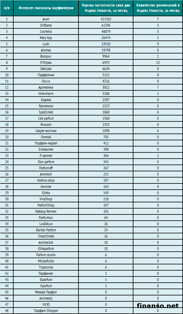 Хорошие духи – неотъемлемая часть образа каждой представительницы слабой половины человечества. Аромат – своеобразное платье, элегантно облегающее женский стан, тянущиеся шикарным шлейфом. Неспроста в Британии часто применяют выражение «носить духи», потому что аромат обязан подчеркнуть индивидуальность, дополнить неповторимый образ. Подробностями интересовались корреспонденты информационно-аналитического издания «Украина сегодня: Finanso.net». Какие именно современные онлайн-магазины парфюмерии во Всемирной паутине выбирают для себя россияне? Какое влияние оказывает пиар в Глобальной сети на рейтинг известности среди потребителей? В этих и остальных вопросах решили разобраться специалисты информационного портала по экономике и рынку валют Форекс «Биржевой лидер». Рейтинг ТОП-известных магазинов парфюмерии в Сети.Рейтинг известности онлайн-магазинов парфюмерии был сформирован на базе нескольких критериев: - оценка частотности слов для системы поиска Яндекс.Директ за месяц, которая рассчитана при помощи сервиса wordstat.yandex.ru; - частота упоминаний об онлайн-магазинах, которая рассчитана с помощью агрегатора news.yandex.ru (Яндекс.Новости); - регион анализа (то есть поиска в сервисе wordstat.yandex.ru) – Российская Федерация. Самые известные онлайн-магазины парфюмерии среди россиян в глобальной сети Интернет признаны по версии экономического онлайн-издания «Биржевой лидер»: - Avon – 421 565 запросов за месяц в Яндексе; - Oriflame – 61 396 запросов за месяц в Яндексе; - Cosmetic – 48 079 запросов за месяц в Яндексе; - Mary Kay – 26 474 запроса за месяц в Яндексе; - Lush – 19 510 запросов за месяц в Яндексе; - Aromas – 19 298 запросов за месяц в Яндексе; - Bonjour – 9 964 запроса за месяц в Яндексе; - Л'Этуаль – 6 955 запросов за месяц в Яндексе; - Delicate – 6 634 запроса за месяц в Яндексе; - Парфюмчик – 5 121 запрос за месяц в Яндексе. Аутсайдеры рейтинга популярности в этом месяце: - Parfum studio – 6 запросов за месяц в Яндексе; - Mirparfuma – 6 запросов за месяц в Яндексе; - Toparoma – 6 запросов за месяц в Яндексе; - Парфюмаг – 1 запрос за месяц в Яндексе; - Elparfum – 1 запрос за месяц в Яндексе; - Xparfum – 1 запрос за месяц в Яндексе; - Мальва Парфум – 0 запросов за месяц в Яндексе; - Aromasky – 0 запросов за месяц в Яндексе; - Vit'Ю – 0 запросов за месяц в Яндексе; - Парфюм Shopper – 0 запросов за месяц в системе поиска Яндексе. |