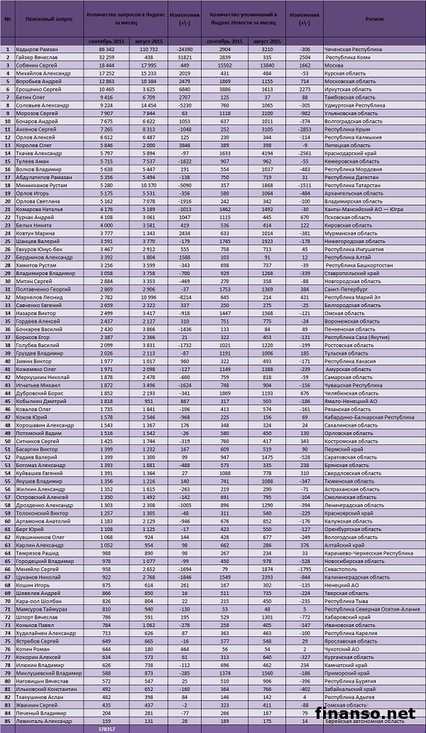 Политическая обстановка в государстве всегда считается ключевой темой обсуждения и вызывает много вопросов и дискуссий. Кто наиболее известный из российских глав регионов – вопрос достаточно значимый, потому что вся современная политика предполагает не просто мастерство выполнения президентских указов, а также указов Госдумы и правительства российскими губернаторами, но еще и умение достучаться до сердец избирателей, стать популярным в родном регионе. Подробностями интересовались корреспонденты издания «Украина сегодня: Finanso.net». По сообщениям портала по экономике «Биржевой лидер», сложной задачей со временем становится формирование рейтинга глав российских регионов при помощи объективного критерия, что без особого труда можно проверить, четко выяснить, у кого из областных глав снижается уровень известности, а у кого растет, каковы причины этого. Кто именно из региональных глав России оказался самым известным в числе пользователей глобальной сети Интернет? Ответ на этот вопрос искали специалисты журнала для деловых людей «Биржевой лидер». ТОП-цитируемых губернаторов РФ в сети Интернет.Рейтинг цитируемости российских глав регионов был сформирован на основании трех основных критериев: - оценка частотности слов для системы поиска Яндекс.Директа за один месяц, что рассчитана с помощью сервиса wordstat.yandex.ru; - частота упоминаний о главах регионов, что рассчитана при помощи агрегатора news.yandex.ru (Яндекс.Новости); - регион анализа (то есть поиска в сервисе wordstat.yandex.ru) – Россия. Из показателей таблицы известно: - первая позиция по известности среди российских глав регионов занята Кадыровым Рамзаном, губернатором Чеченской Республики, потому что по нему граждане России произвели самое большое число запросов в сентябре нынешнего года (86 342); - вторую позицию занимает Гайзер Вячеслав, глава Республики Коми. - третья позиция досталась Сергею Собянину, главе города Москвы. Какие коррективы произошли с популярностью губернаторов в сентябре? Уровень известности губернаторов РФ зависит от принятых решений, активности в области пиар, рекламы, иных факторов. Вот каким образом показатели числа запросов в августе изменялись в сравнении с минувшим месяцем: 1. Лидером этого рейтинга по росту общего числа запросов за месяц стал Гайзер Вячеслав ( плюс 31 821 запрос в Яндексе); 2. Самое высокое снижение уровня оказалось у Кадырова Рамзана (минус 24 390 запросов за месяц). |