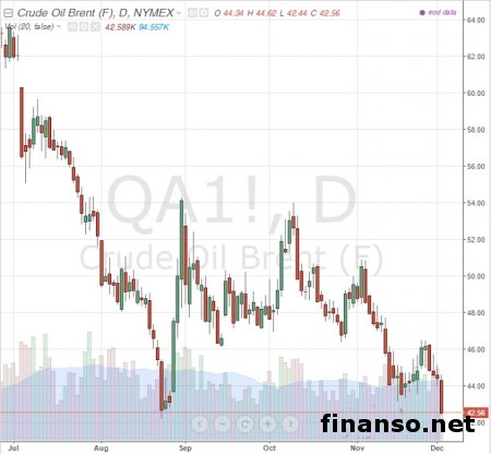 2 декабря 2015 года котировки нефти снова стали снижаться, упав до уровня в 44 американских доллара. Цена контрактов по нефти смеси Brent с поставкой в январе следующего 2016 года просела во время нынешних продаж на ICE до уровня в 43,88 доллара Америки, упав в стоимости, в сравнении с фактическим закрытием вчерашних торгов, примерно на 1,26 процента. Подробностями интересовались корреспонденты информационного издания онлайн «