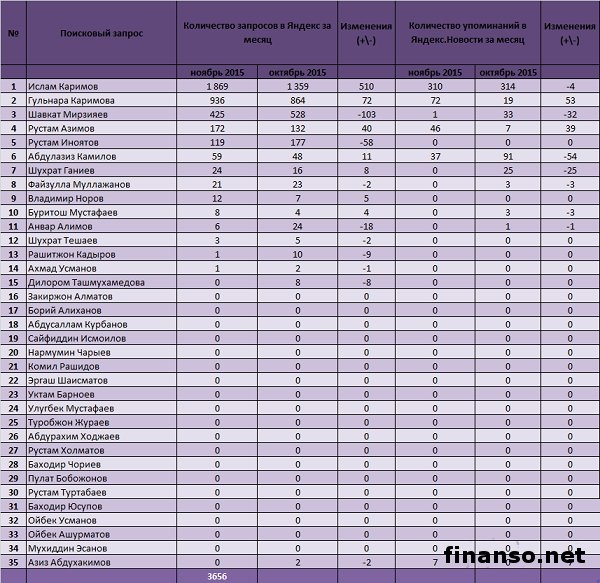 Каждый политдеятель обязан тщательным образом следить за каждым своим словом, поддерживать имидж, соответствовать безупречной репутации. При этом совсем не имеет значения, о политике какого государства идет речь: Украины, Российской Федерации, Казахстана или Узбекистана и тому подобное. Помимо прочего, имя политика, если он намерен и дальше продолжать политкарьеру, всегда остается на слуху у граждан государства, потому что без этого у него фактически не остается шансов пройти в парламент, построить карьеру в ближайшем будущем. То есть, проще говоря, необходимо работать и жить так, чтобы его персоной интересовались и самые простые граждане государства, и многочисленные средства массовой информации.Какой современный узбекский политик в настоящее время считается самым известным? Ответ на этот вопрос искали специалисты информационно-аналитического издания «Украина сегодня: Finanso.net». Рейтинг популярности политиков РУ за ноябрь.По сообщениям портала по экономике «Биржевой лидер», рейтинг был сформирован на основании двух прозрачных и объективных показателей, которые помогут в вопросе выбора организации. Это: - общее количество вводимых запросов в систему поиска Яндекс за месяц (регион поиска – РФ); - общее количество упоминаний о том или ином политике в масс-медиа, то есть в интернет-изданиях агрегатора новостей Яндекс.Новости; - регион поиска – РУ. Таблица показывает: - первое место рейтинга известности узбекских политиков по праву занимает глава государства Ислам Каримов, по нему было произведено 1 869 запросов в системе поиска Яндекс в ноябре этого года; - вторая не менее почетная позиция досталась дочери действующего главы государства Гульнаре Каримовой с ее 936 запросами за месяц. Она, как известно, считается председателем попечительского совета Фонда Форум культуры и искусства РУ. В минувшем году у Каримовой фиксировались проблемы в связи с ее амбициями, желанием стать во главе страны, она даже попала под домашний арест; - третье место досталось на этот раз по праву известному в РУ политику, Шавкату Мирзияеву, премьер-министру Узбекистана, который раньше занимал место главы Джизакской и Самаркандской областей. По нему было произведено 425 запросов в системе поиска Яндекс. Далее в таблице-рейтинге располагаются такие деятели политики: - Рустам Азимов – 172 запроса; - Рустам Иноятов – 119 запросов; - Абдулазиз Камилов – 59 запросов. |