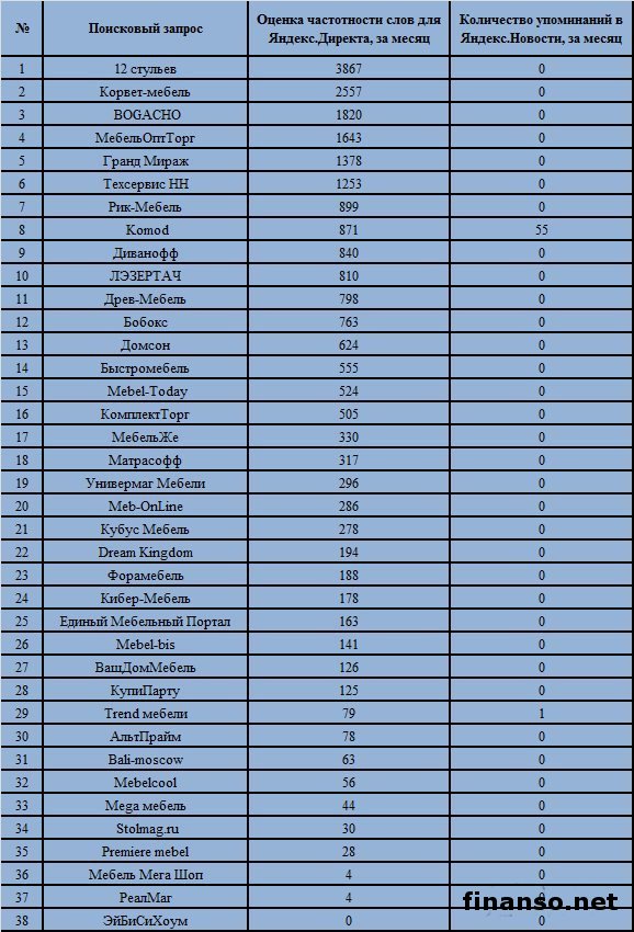 В современном мире, где особенное значение имеет время, люди все чаще и чаще совершают свои покупки с помощью глобальной сети Интернет. А точнее, речь идет о специализированных онлайн-магазинах. С каждым днем их количество растет, их становится в глобальной сети все больше и больше, и они пользуются популярностью. В то же время выбор необходимых товаров широк. Чтобы не потеряться в подобном многообразии, выбрать на самом деле ответственного и надежного партнера, нужно обратить особое внимание на их рейтинг в числе граждан Российской Федерации. С этим вопросом четко разбирались специалисты информационно-аналитического издания по экономике «Биржевой лидер». Подробностями интересовались корреспонденты издания «Украина сегодня: Finanso.net». Топ известности онлайн-магазинов мебели в РФ.Рейтинг известности онлайн-магазинов мебели формировался на основе трех основных критериев: - оценка частотности слов для системы поиска Яндекс.Директа за последний месяц, которая рассчитана при помощи специального сервиса wordstat.yandex.ru; - частота упоминаний об онлайн магазине в интернет-изданиях России, что рассчитана при помощи агрегатора news.yandex.ru (Яндекс.Новости); - регион анализа (а значит, поиска в сервисе wordstat.yandex.ru) – Российская Федерация. Самые известные у россиян интернет-магазины мебели: - первое почетное место рейтинга отдано по праву интернет-магазинам «12 стульев» – 3 867 запросов в системе поиска Яндекс за последний месяц. Мебельный центр «12 стульев» находится у Балканской площади, у станции метро «Купчино». На трех этажах центра размещены экспозиции мебельных фирм, фабрик города Санкт-Петербурга, остальных российских регионов, салоны главных мебельных компаний Европы. Вниманию гостей предлагается огромный выбор корпусной, мягкой мебели, кухонные гарнитуры, мебель для дома, офиса, детская мебель, сопутствующие товары; - второе место отдано интернет-магазину мебели «Корвет-мебель» – 2 557. В настоящее время фирма считается лидером в числе основных производителей высококачественной корпусной мебели эконом-класса в центре с фирменными выставочными залами в Москве, Иваново, Костроме, Владимире, местах Нижегородской и Владимирской областей площадью 2500 кв. м; - третье место занято магазином BOGACHO – 1 820 запросов в Яндексе. Фирма BOGACHO – единственная в РФ, что производит предметы интерьера, аксессуары для любой зоны жилого пространства: прихожей, гостиной, кухни и рабочего кабинета. |