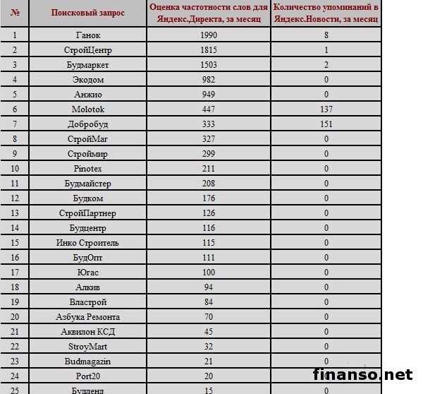Сейчас рынок стройматериалов развивается достаточно быстрыми темпами. В продаже все чаще появляются новейшие строительные материалы, оборудование, инструменты, разрабатываются технологии, дающие возможность ускорять процесс ремонта и строительства. Иностранные и украинские производители придумывают презентации товаров, постепенно внедряя их на рынок. Разнообразие огромное, каждый покупатель может выбрать для себя то, что его устроит как по качественным характеристикам, так и по стоимости. Подробностями интересовались корреспонденты информационно-аналитического издания «Украина сегодня: Finanso.net». Какие наиболее известные в Украине онлайн-магазины строительных материалов? Ответ на этот вопрос искали специалисты главного рекламного агентства E-iq специально для издания «Биржевой лидер». Рейтинг известности онлайн магазинов по продаже стройматериалов.Рейтинг сформирован на основании двух прозрачных и объективных показателей, что окажут поддержку в вопросе выбора компании: - общее число вводимых запросов в систему поиска Яндекс за месяц (регион поиска – Украина); - общее число упоминаний о той или иной компании в средствах массовой информации, то есть в онлайн-изданиях агрегатора новостей Яндекс.Новости. Данные таблицы, полученной благодаря сервису Яндексе.Директ, показывают: 1. Лидер рейтинга – интернет-магазин «Ганок», который последние лет десять специализируется на поставках качественных строительных материалов от лучших зарубежных и украинских производителей из Германии, Франции, Хорватии, Польши и Венгрии, а также остальных ведущих государств всего земного шара. 2. Второе не менее почетное место рейтинга досталось по праву интернет-магазину «Стройцентр», который последние лет 15 работает на украинском рынке стройматериалов. Фирма быстро развивается, все время расширяет выбор своей продукции. 3. Третье место рейтинга досталось по праву компании «Будмаркет» – крупнейшему супермаркету отделочных и строительных материалов, где презентован большой выбор товаров на любой кошелек и вкус. Далее в рейтинге располагаются такие строительные магазины: - Экодом – 982 запроса в системе поиска Яндекс; - Анжио – 949 запросов в системе поиска Яндекс; - Molotok – 447 запросов в системе поиска Яндекс; - Добробуд – 333 запроса в системе поиска Яндекс; - СтройМаг – 327 запросов в системе поиска Яндекс; - Строймир – 299 запросов в системе поиска Яндекс; - Pinotex – 211 запросов в системе поиска Яндекс. |