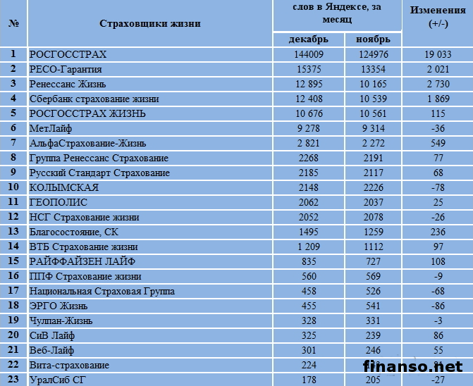 Страхование жизни – это один из самых важных и актуальных вопросов, особенно в настоящее время, когда информацией о катаклизмах природы, терактах, техногенных катастрофах и иных несчастьях переполнены все средства массовой информации. В подобных условиях страхование жизни хотя и не сумеет при наступлении страхового случая компенсировать людям утраты близких, даст возможность им разрешить множество проблем, а часто дает особые средства к существованию.Какие фирмы-страховщики жизни считаются в настоящее время самыми известными среди российских граждан? Ответ на этот вопрос искали специалисты информационно-аналитического издания «Украина сегодня: Finanso.net», исходя из материалов журнала для инвесторов «Биржевой лидер». Рейтинг известности страховщиков жизни в ноябре-декабре 2015 года.Рейтинг известности фирм, что специализируются на страховании жизни, в числе россиян формировался на основании нескольких базовых критериев: - оценка частотности слов для Яндекс.Директа за месяц, что рассчитана с помощью специального сервиса wordstat.yandex.ru; - число упоминаний одного или другого страховщика за то же время в электронных масс-медиа России, которое рассчитано с помощью агрегатора Яндекс.Новости (news.yandex.ru); - самая известная компания, занимающаяся страхованием жизни – компания РОСГОССТРАХ (144 009 запросов в системе поиска Яндекс за месяц). Это одна из самых больших, старейших страховых фирм в РФ, что занимается разными типами страхования, включая страхованием жизни. Она, как известно, имеет филиалы в разных регионах государства; - вторая не менее важная позиция у компании РЕСО-гарантия – 15 375 запросов. РЕСО-Гарантия – это страховая универсальная компания, открытая в 1991 году. Фирма обладает лицензией на сто типов страхуслуг, перестраховочной деятельностью. Филиальная сеть относится к числу самых больших в стране, она распространена по всем регионам государства. Услугами и продуктами компании РЕСО-Гарантия пользуется свыше 10 млн. клиентов, в их числе частные лица и организации; - третье место в числе лидеров досталось компании Ренессанс Жизнь, по ней произведено 12 895 запросов в системе поиска Яндекс за месяц. Страховая фирма работает с 2004 года, считается лидером рынка РФ по страхованию жизни. У фирмы создана целая сеть представительств, в состав которой вошло свыше 60 отделений по всему государству. |