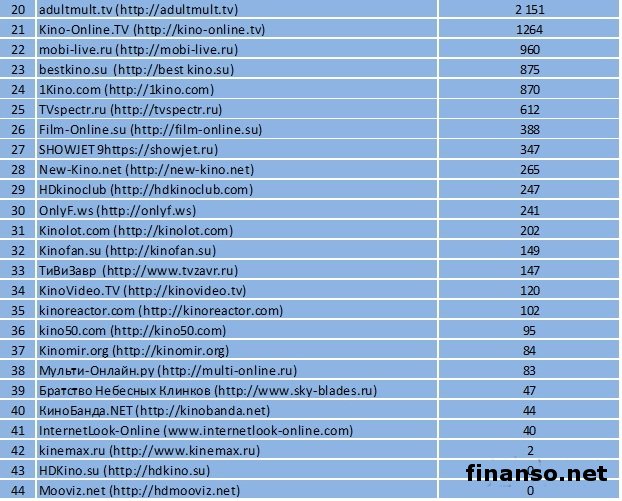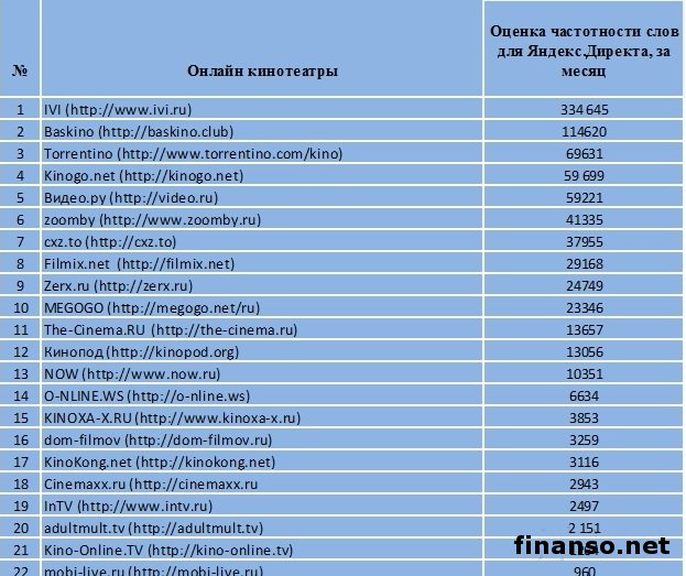 В последнее время новые кинофильмы выпускаются чаще, и посмотреть все, что того или иного человека интересует, именно в кинотеатрах не представляется реальным. Развитие технологий помогает отыскать киноленты за считанные минуты, посмотреть их в хорошем качестве. Такой просмотр помогает экономить время и деньги без необходимости подстраиваться под расписание работы самого кинотеатра. Безусловно, онлайн-кинотеатры не способны полностью заменить эмоций, которые может обеспечить классический кинотеатр. Тем не менее это дает полную свободу выбора кинофильма по настроению и желанию. Подробностями интересовались корреспонденты информационно-аналитического издания «Украина сегодня: Finanso.net».Как стало известно журналистам информационно-аналитического издания по экономике и предпринимательству «Биржевой лидер», сейчас в глобальной сети Интернет есть много онлайн-кинотеатров. Какие именно онлайн-кинотеатры считаются самыми известными в Российской Федерации? Ответ на этот вопрос искали специалисты маркетингового агентства E-iq. Рейтинг популярности кинотеатров в РФ за январь.Рейтинг известности онлайн-кинотеатров среди российских граждан формируется на основании основных критериев: - оценка частотности слов для системы поиска Яндекс.Директ за месяц, которая рассчитана с помощью специального сервиса wordstat.yandex.ru; - общее число упоминаний о том или ином онлайн-кинотеатре за то же время в электронных средствах массовой информации России, которое рассчитано с помощью агрегатора поиска в системе Яндекс.Новости (news.yandex.ru); ТОП-популярных сервисов: - наиболее известным онлайн-кинотеатром признан «IVI» (http://www.ivi.ru) – 334 645 запросов в системе поиска Яндекс за 30 дней; - второе, не менее почетное место занято онлайн-кинотеатром Baskino (http://baskino.club) – 114620 запросов в поисковой системе Яндекс за 30 дней месяц; - последняя третья строка рейтинга досталась по праву кинотеатру Torrentino (http://www.torrentino.com/kino), по нему произведено 69631 запрос. Дальше идут: ▪ Kinogo.net (http://kinogo.net) – 59 699 запросов в Яндекс; ▪ Видео.ру (http://video.ru) – 59221 запрос в Яндекс; ▪ zoomby (http://www.zoomby.ru) – 41335 запросов в Яндекс; ▪ cxz.to (http://cxz.to) – 37955 запросов в Яндекс; ▪ Filmix.net (http://filmix.net) – 29168 запросов в Яндекс; ▪ Zerx.ru (http://zerx.ru) – 24749 запросов в Яндекс; ▪ MEGOGO (http://megogo.net/ru) – 23346 запросов в Яндекс; ▪ The-Cinema.RU (http://the-cinema.ru) – 13657 запросов в Яндекс; ▪ Кинопод (http://kinopod.org) – 13056 запросов в Яндекс; ▪ NOW (http://www.now.ru) – 10351 запрос в Яндекс; ▪ O-NLINE.WS (http://o-nline.ws) – 6634 запроса в Яндекс. |