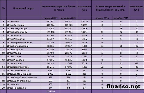 Вот уже в течение долгих лет как раз компьютерные игры принято считать одной из самых перспективных областей для инвестиций, потому что их известность не просто не гаснет с течением времени, но и быстро набирает обороты. Стоит заметить: игры для ПК находят потребителей не только среди мужчин, которых по каким-то необъяснимым причинам принято считать заядлыми игроками, но и среди дам, а также многих подростков. Помимо прочего, есть большое количество популярных игровых проектов для детей, которые помогают самым маленьким развивать смекалку и познавать окружающий нас мир. Подробностями интересовались корреспонденты информационно-аналитического издания «Украина сегодня: Finanso.net».Помимо прочего, детские игры для ПК можно условно поделить на игры для девочек и проекты для мальчиков. Вся разница в том, что мальчишки отдают предпочтение играм в более активные проекты, к примеру, такие как шутеры и бродилки. При этом девочки отдают предпочтение стратегиям и играм, которые переполнены разными «женскими штучками». Какие известные игры для девочек на данный момент времени, анализировали маркетологи главного рекламного агентства E-iq для журнала «Биржевой лидер». ТОП известности игр для девочек в Глобальной сети за январь 2016 года.Рейтинг известности среди россиян игровых проектов для девочек формировался на основании таких критериев: - оценка частотности слов для системы поиска Яндекс.Директ за последние 30 дней, что рассчитана с помощью сервиса wordstat.yandex.ru; - число упоминаний за то же время о том или ином проекте для девочек в электронных СМИ, рассчитанное при помощи агрегатора Яндекс.Новости (news.yandex.ru). - регион оценки – Россия. Таблица показывает, что: первое почетное место рейтинга отдано по праву игровому проекту для девочек под названием «Винкс». Он был придуман на основе одноименного мультика «Клуб Винкс: школа волшебниц», транслируемого по ТВ. По этой игровой серии было произведено самое большое число запросов в системе поиска Яндекс в январе 2016 года – 482 352; на втором месте рейтинга известности – проекты «Одевалки», где девочки могут проявить таланты стилиста и дизайнера, переодевая и украшая персонажа на личный вкус. 416 374 запроса в системе поиска Яндекс; третья позиция рейтинга отдана по праву играм «Симуляторы», которые имитируют управление каким-то видом транспорта, к примеру, авто, мотоциклом, а также самолетом или поездом. Основополагающий принцип симулятора – воспроизведение особенностей какой-либо тематической области. По ним было произведено ровно 306 123 запроса за месяц. |
