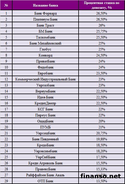 На данный момент времени большая часть финансовых учреждений предлагает своим клиентам разные депозитные программы, в числе которых бывает не просто отличить наиболее выгодные и не совсем. Большинство инвесторов, боясь утратить личные финансовые средства, диверсифицируют инвестиции, распределяя их в различные активы, включая и активы в недвижимость. И инвестировать сбережения в банки никто не спешит, ставки не столь уж и привлекательные. Подробностями интересовались корреспонденты информационно-аналитического издания «Украина сегодня: Finanso.net».«Биржевой лидер» решил выяснить, какие именно банковские вклады считаются самыми выгодными для украинских граждан, какие факторы важно брать в учет при выборе программы депозитов. Рейтинг выгодных предложений по вкладам в украинские банки.Рейтинг наиболее выгодных вкладов, которые предлагают украинские банки, был сформирован при учете ставок по депозитам. Какие украинские финучреждения предлагают самые выгодные на данный момент времени депозитные программы, четко можно увидеть из специальной таблицы: По итогам проведенного анализа от экспертов издания были определены наименее и наиболее выгодные условия по вкладам. Самые выгодные программы депозитов предлагаются «Банком Форвард» и «Платинум Банком». Здесь кредитная ставка составляет 26,5 процента годовых. Банк предоставляет большой выбор услуг, банковских продуктов. Достаточно выгодные программы депозита предлагает «Банк Траст» со своими 26 процентами годовых по вкладам. Это активно развивающиеся учреждения, которые предоставляют полную свободу управления денежными средствами своим клиентам. Далее в рейтинге известности размещаются такие банки: - «КредоБанк»; - «УкрСибБанк»; - «Укрэксимбанк»; - «Креди Агриколь Банк»; - «Райффайзен Банк Аваль»; - «ПравексБанк»; - «ОТП Банк». ТОП популярности украинских банков в Сети. Рейтинг издания опирается на два объективных критерия в системе поиске Яндекс: - оценка частотности слов для системы поиска Яндекс.Директ за последний месяц, что рассчитана при помощи сервиса wordstat.yandex.ru; - общее число упоминаний за то же время о системе оплаты в онлайн масс-медиа, электронных информагентствах, что рассчитано с помощью агрегатора Яндекс.Новости (news.yandex.ru); - регион оценки - Украина. Самые известные в Интернете среди граждан Украины банковские учреждения, которые предоставляют выгодные программы по депозитам: - «ПриватБанк» – 525 352 запроса в Яндексе; - «ОщадБанк» – 255 022 запроса в Яндексе; - ПУМБ – 130 213 запросов в Яндексе; - «УкрСибБанк» – 90 344 запроса в Яндексе; - «Укрсоцбанк» – 30 735 запросов в Яндексе; - «Укргазбанк» – 24 775 запросов в Яндексе; - «ОТП Банк» – 17 705 запросов в Яндексе; - «Банк Михайловский» – 17 472 запроса в Яндексе. |