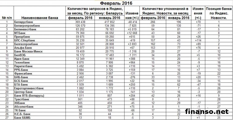 Аналитики студии интернет маркетинга E-IQ вместе с информационно-аналитическим порталом «Бизнес лидер» составили рейтинг банков Беларуси за февраль 2016 года, составляемый каждый месяц, по данным в запросах поисковой системы Яндекс и числом упоминания названия банка в онлайн-средствах массовой информации.Как отмечают эксперты издания «Украина сегодня: Finanso.net», за февраль каких-либо изменений не наблюдалось, поэтому все банки и далее продолжают сохранять точно такие же позиции, которые были у них и месяц назад: Так, на первом месте с существенным отрывом от конкурентов, как всегда, Беларусбанк. На второй позиции находится также бессменный ее обладатель - Белагропромбанк. На третьем месте расположился Белинвестбанк. Сохранил за собой четвертое место МТБанк. Пятерку лидеров завершает Приорбанк. За много лет составления рейтинга в первый раз пятерка банков-аутсайдеров тоже осталась прежней. Подобно минувшему месяцу в ее состав вошли те же банки: ХКБанк, Абсолютбанк, ТК Банк, Н.Е.Б. Банк и Банк ББМБ. |