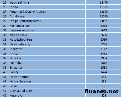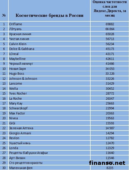 Существующий на данный момент времени разнообразный и большой выбор косметики способен в полной мере удовлетворить фактически все потребности человека. Все косметические средства можно поделить на такие разновидности: косметика для ухода, защитная косметика и декоративная косметика. Помимо прочего, по вариантам использования косметику принято делить на профессиональную и массовую.Выбирая косметику, крайне важно в первую очередь сосредоточить внимание на ее качестве. Исходя из этого, стоит предпочесть изделия проверенных и известных компаний-производителей. Желательно приобретать косметические средства в больших магазинах, где выше сама вероятность избежать подделки. Естественно, необходимо четко изучить состав самого продукта, учесть индивидуальные особенности, аллергию на какой-то из ингредиентов. Какова известность косметики в РФ? Какие косметические марки, презентованные на рынке России, наиболее известны среди граждан, проанализировали работники маркетингового агентства E-iq для онлайн издания Рейтинг известности средств косметики среди россиян в системе поиска Яндекс.Для четкого определения рейтинга известности марок косметики в РФ часто используются такие критерии: - частотность слов для системы поиска Яндекс.Директа за март, которая определяется с применением сервиса wordstat.yandex.ru; - общее количество упоминаний о разных марках в электронных отечественных СМИ, определяемое с применением агрегатора Яндекс.Новости (news.yandex.ru); 1. Первое почетное место отдано по праву косметическим маркам Oriflame – 69 882 запроса за март в системе поиска Яндекс. Годовой оборот данной компании из Швеции достигает размеров в 1,4 млрд. евро, презентована она в свыше чем 60 государствах, имеет более 7500 работников. 2. Второе место за компанией ЛЭтуаль – 66 864 запроса за март в системе поиска Яндекс. Сеть парфюмерно-косметических магазинов компании распространена в РФ и на ближнем зарубежье. 3. Третье место – за магазинами Красной линии, по ней за март было успешно произведено 65 028 запросов. Продукция фабрики презентована и продается в разных российских регионах, а также в государствах СНГ. Далее следуют: · Чистая линия – 56 713 запросов; · Calvin Klein – 56 234 запроса в Яндекс; · Dolce & Gabbana – 45 173 запроса в Яндекс; · LOreal – 43 171 запрос в Яндекс; · Maybelline – 42 611 запрос в Яндекс; · Черный жемчуг – 41 466 запросов в Яндекс; · Новая Заря – 34 053 запроса в Яндекс; · Hugo Boss – 33 226 запросов в Яндекс; · Johnson & Johnson – 33 226 запросов в Яндекс; · Lancome – 31 429 запросов в Яндекс; · Wella – 30 452 запроса в Яндекс; · Yves Rocher – 28 772 запроса в Яндекс; · La Roche – 26 347 запросов в Яндекс; · Mary Kay – 25 663 запроса в Яндекс; · Schwarzkopf – 22 994 запроса в Яндекс. |