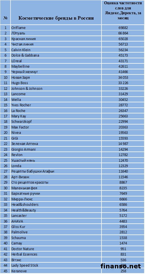 Ныне существующий разнообразный и просто огромный выбор косметики способен удовлетворить фактически существующие потребности человека. Все косметические средства можно поделить на такие разновидности: косметика для ухода, защитная косметика, декоративная косметика. Помимо прочего, по вариантам применения косметику можно поделить на профессиональную и массовую. Подробностями интересовались корреспонденты информационно-аналитического издания «Украина сегодня: Finanso.net».Как стало известно журналистам информационно-аналитического издания по экономике и предпринимательству «Биржевой лидер», выбирая косметические средства, нужно в первую очередь обращать особое внимание на ее качество. Поэтому стоит отдать предпочтение изделиям проверенных и известных компаний-производителей. И стоит приобретать косметику в больших магазинах, где выше уровень вероятности избежать подделок. Безусловно, есть смысл подробно ознакомиться с составом продукта, учесть индивидуальные особенности, вариант аллергической реакции на один из ингредиентов. Какова же известность косметики в РФ? Какие косметические марки, презентованные на рынке РФ, самые известные среди граждан, выясняли журналисты и работники маркетингового агентства E-iq. Рейтинг известности косметических марок у россиян в Яндекс.Для составления рейтинга известности марок российской косметики были использованы главные критерии: - частотность слов для системы поиска Яндекс.Директ в марте, которая определяется с применением сервиса wordstat.yandex.ru; - общее число упоминаний той или иной марки в электронных СМИ, которое определяется с применением агрегатора Яндекс.Новости (news.yandex.ru). 1. Первое место в числе косметических марок досталось по праву компании Oriflame – 69 882 запроса за март в Яндекс. Годовой оборот шведской фирмы составляет примерно 1,4 млрд. евро. Компания широко представлена в 60 странах, имеет свыше 7500 работников. 2. Второе место отдано компании ЛЭтуаль – 66 864 запроса за март в Яндексе. Сеть парфюмерно-косметических розничных магазинов компании распространена в РФ, в ближнем зарубежье; 3. Третьей в этом рейтинге стала компания Красная линия, по ней за март произведено 65 028 запросов. Продукция косметической компании Красная Линия продается в разных российских регионах, государствах СНГ. Далее следуют: · компания Чистая линия – 56 713 запросов; · компания Calvin Klein – 56 234; · компания Dolce & Gabbana – 45 173; · компания LOreal – 43 171; · компания Maybelline – 42 611; · компания Черный жемчуг – 41 466; · компания Новая Заря – 34 053; · компания Hugo Boss – 33 226; · компания Johnson & Johnson – 33 226; · компания Lancome – 31 429; · компания Wella – 30 452; · компания Yves Rocher – 28 772; · компания La Roche – 26 347; · компания Mary Kay – 25 663; · компания Schwarzkopf – 22 994; · компания Max Factor – 20 363; · компания Nivea – 19 563. |