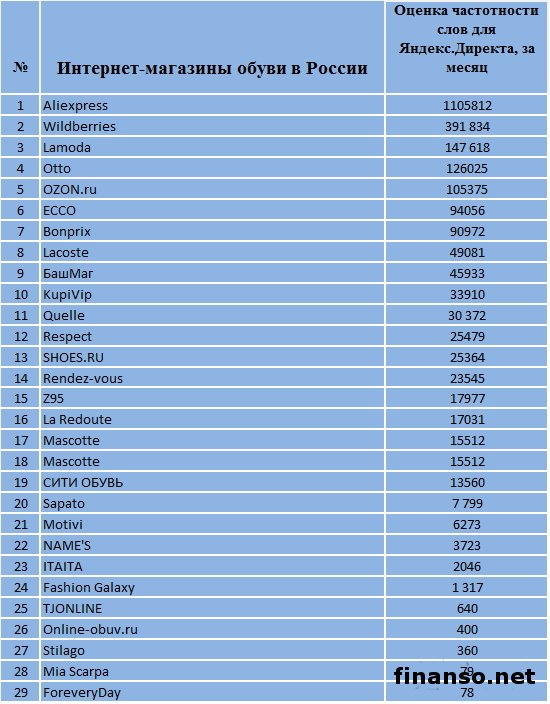 Онлайн технологии в настоящее время в Российской Федерации набирают все большую известность, а также все более серьезные обороты набирают и покупки разных товаров с помощью магазинов в сети. Все это дает возможность экономить силы и время. В том числе обувь граждане РФ все чаще начинают покупать, пользуясь при этом виртуальными ресурсами.Сориентироваться в числе подобного разнообразия онлайн магазинов обуви, которые предлагают товары разного качества, с различными условиями оплаты и доставки, качеством товаров, а также удобством их оплаты, получения может помочь специальный рейтинг. Какие онлайн магазины одежды и обуви считаются самыми известными, четко определили работники специального маркетингового агентства E-iq для интернет-издания Топ известности у граждан РФ онлайн магазинов обуви.Рейтинг известности интернет-магазинов обуви в России был сформирован на основе: - частотности слов для системы поиска Яндекс.Директа, отысканной при помощи wordstat.yandex.ru; - общее число упоминаний об онлайн магазине в интернет-СМИ России, выявленного при помощи агрегатора Яндекс.Новости (news.yandex.ru). - Во главе рейтинга популярности среди россиян стоит обувной интернет-магазин Aliexpress - 1 105 812 запросов за месяц в системе поиска Яндекс; - второе место отдано по праву магазину Wildberries - 391 834 запроса в Яндексе в марте; - третье место досталось на этот раз - интернет-магазину Lamoda, по нему в марте было успешно произведено 147 618 запросов. Далее следуют: · Otto – 126 025 запросов в Яндексе; · OZON.ru – 105 375 запросов в Яндексе; · ECCO – 94 056 запросов в Яндексе; · Bonprix – 90 972 запроса в Яндексе; · Lacoste – 49 081 запрос в Яндексе; · БашМаг - 45 933 запроса в Яндексе; · KupiVip - 33 910 запросов в Яндексе; · Quelle - 30 372 запроса в Яндексе; · Respect – 25 479 запросов в Яндексе; · SHOES.RU – 25 364 запроса в Яндексе; · Rendez-vous – 23 545 запросов в Яндексе; · Z95 – 17 977 запросов в Яндексе; · La Redoute – 17 031 запрос в Яндексе; · Mascotte – 15 512 запросов в Яндексе; · Mascotte – 15 512 запросов в Яндексе; · СИТИ ОБУВЬ - 13 560 запросов в Яндексе. В числе аутсайдеров рейтинга числятся такие магазины: · Sapato - 7 799 запросов в Яндексе; · Motivi – 6 273 запросов в Яндексе; · NAME'S – 3 723 запросов в Яндексе; · ITAITA – 2 046 запросов в Яндексе; · Fashion Galaxy - 1 317 запросов в Яндексе; · TJONLINE – 640 запросов в Яндексе; · Online-obuv.ru - 400 запросов в Яндексе; · Stilago – 360 запросов в Яндексе; · Mia Scarpa – 79 запросов в Яндексе; · ForeveryDay - 78 запросов в Яндексе. |