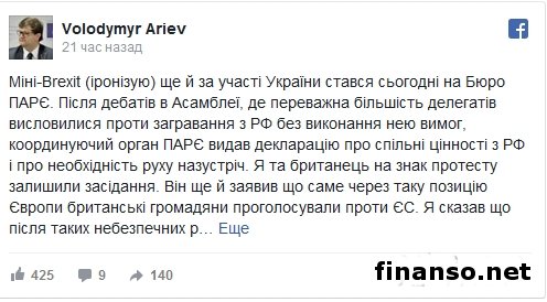 Как удалось выяснить корреспондентам новостного интернет-портала «Украина сегодня: Finanso.net», В. Арьев отметил, что подавляющее большинство делегатов после дебатов в Ассамблее высказались против заигрывания с РФ без выполнению ею требований. Однако координирующий орган ПАРЕ издал декларацию об общих с РФ ценностях и о необходимости движения навстречу. Президент ПАСЕ Педро Аграмунт, по словам В. Арьева, поддержал эту декларацию. Руководитель украинской делегации в ПАРЕ написал, что «он разочарован Президентом ПАСЕ П. Аграмунтом, который в Киеве недавно рассказывал, какой он друг Украинскому государству». По сообщению депутата, он, а также представитель Великобритании в знак протеста покинули заседание Бюро. В. Арьев при этом уточнил, что по заявлению британца, именно из-за такой позиции Европы британские граждане проголосовали против ЕС. Такие опасные решения ведут к безответственности.По заявлению Д. Арьева, «после таких опасных решений каждый сможет делать, что ему вздумается, не обращая внимание на Совет Европы, поскольку избежание ответственности будет лишь вопросом времени». Ранее сообщалось, что в ПАРЕ рассматриваются возможности возвращения в ассамблею российской делегации на полноправной основе. По заявлению депутата от Нидерландов Тини Кокс, делегация РФ сможет вернуться для участия в работе ассамблеи ПАРЕ после выборов и обновления российской Госдумы. Напомним, что российская делегация до настоящего времени находится под санкциями ПАРЕ, наложенными на нее в апреле 2014 г. из-за аннексии Крыма. Согласно соответствующей резолюции, российские депутаты были лишены права голоса в ПАРЕ, а также права быть представленными в его руководящих органах. Санкции к российской делегации с тех пор дважды были продолжены, а в соответствующих документах ассамблеи РФ призывали вернуть Крым, прекратить военную агрессию в Донбассе и вывести российские войска с украинской территории. Также в январе этого года сообщалось, что РФ не сможет сформировать свою делегацию в ПАРЕ, пока не проведет парламентские выборы. |